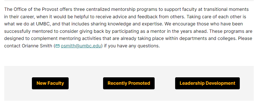 I am delighted to announce that the Office of the Provost is piloting three faculty mentorship workshop programs this year, beginning in October. These programs are intended to provide institutional level support to faculty at transitional moments in their career when it would be helpful to receive advice and feedback from others. The three centralized faculty mentoring programs are for new faculty (hired within the past three years), recently promoted faculty, and for new leaders (chairs, program directors, center directors, major committee chairs, etc). The workshops are optional and are designed to complement mentoring activities that are already taking place within departments and colleges.
