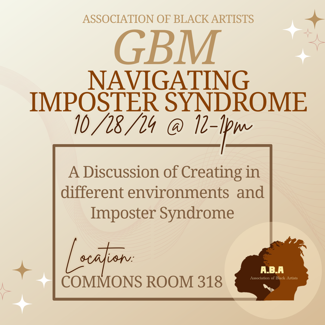 Join us TOMORROW in Commons 318 for our next GBM of the semester! We’ll be discussing how to navigate imposter syndrome, and creating in different environments!