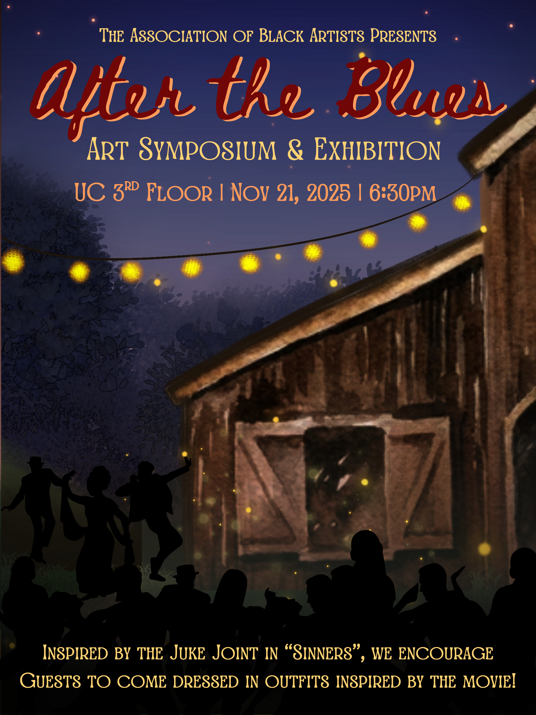 This Friday is our bi-annual Art Symposium and Exhibition! Happening in University Center 3rd Floor, join us as we celebrate the incredible works & performances of black artists on campus! This semester's theme is inspired by Juke Joint from Ryan Coogler's "Sinners". We'll see you there!