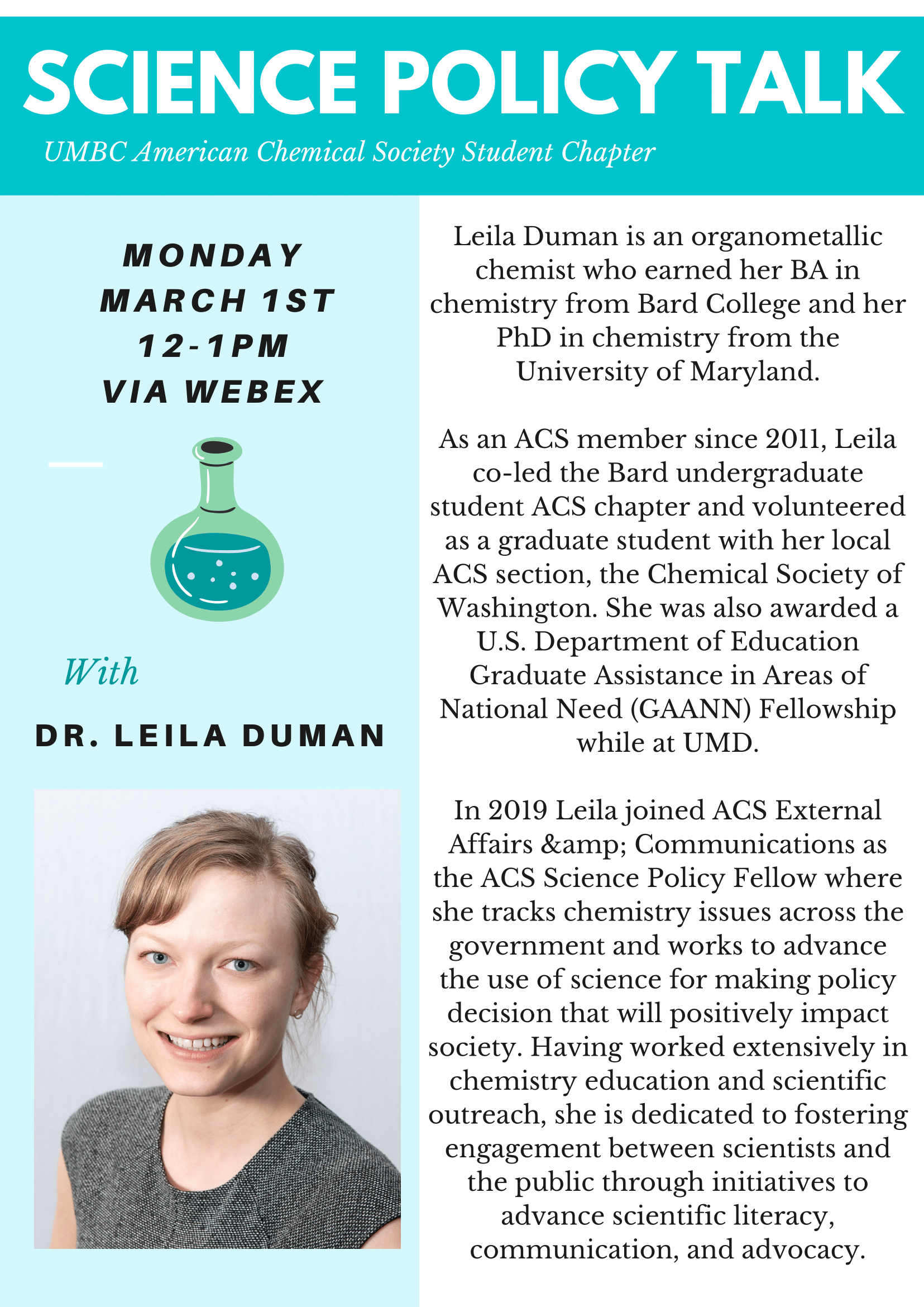 Join us for an exciting presentation about science policy on Monday, March 1st from 12-1pm! Learn about how ACS advocates for Chemistry and STEM-related issues in the government with ACS's public policy fellow and chemist Dr. Leila Dunham!