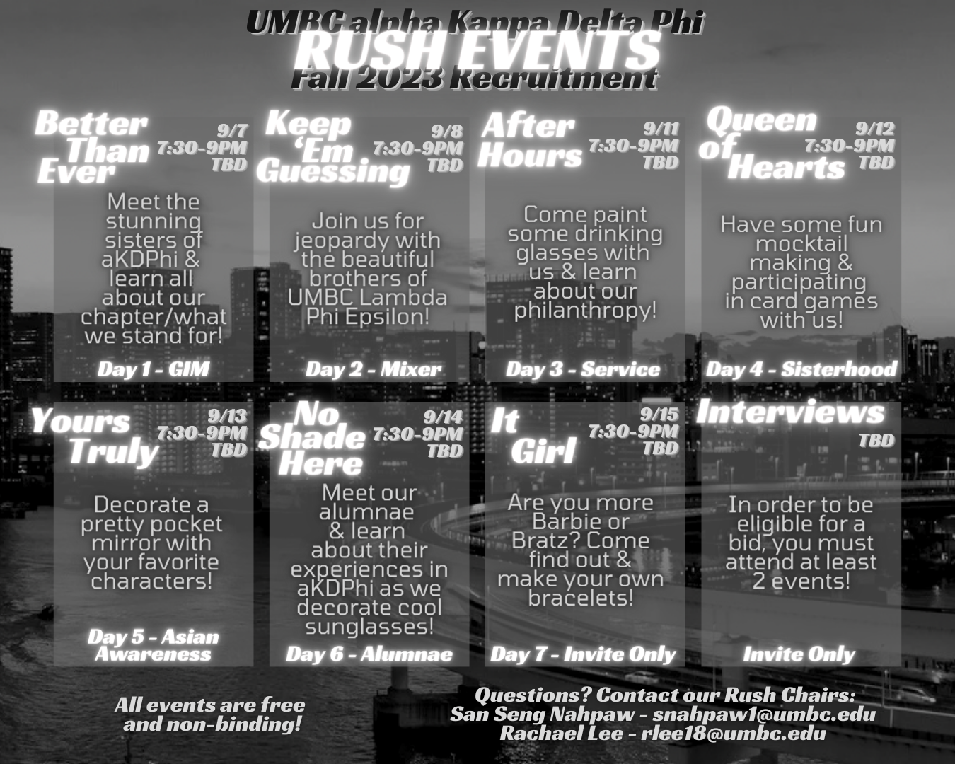 The Sisters of UMBC aKDPhi Pre-Associate chapter are happy to present our Fall 2023 Rush Week!
