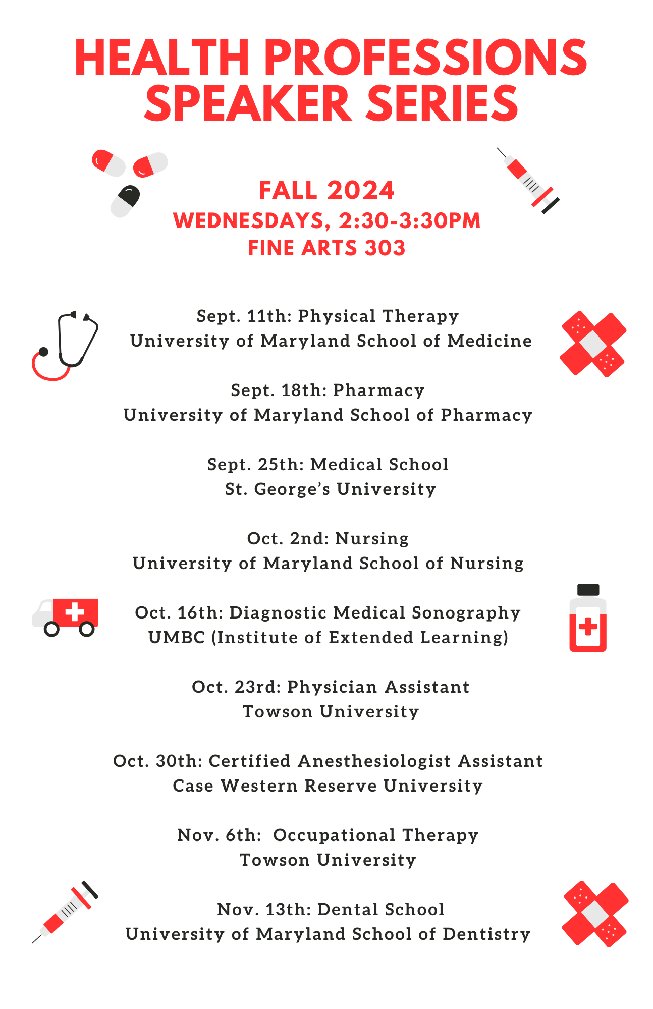 Join us on Wednesdays, 2:30-3:30pm in Fine Arts 303 to hear from guest speakers in various health professions!