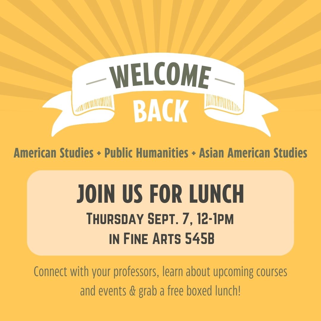 We invite you to pick up a boxed lunch and reconnect with your professors in Fine Arts 545-B. Come find out more about a degree in American Studies and our other exciting programs for this academic year.