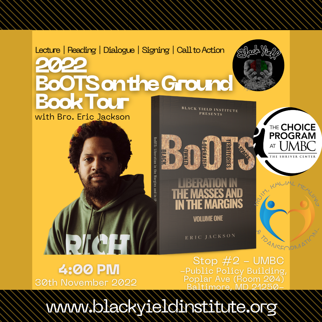 The Choice program, based at The Shriver Center is pleased to invite you to a book talk with Eric Jackson, servant-director of the Black Yield Institute and invited panelists on Wednesday, November 30th from 4-5:30pm in Public Policy 204. The talk will draw on themes from BoOTS: Liberation in the Masses and in the Margins, recently published by BYI. See the attached flier for more info!