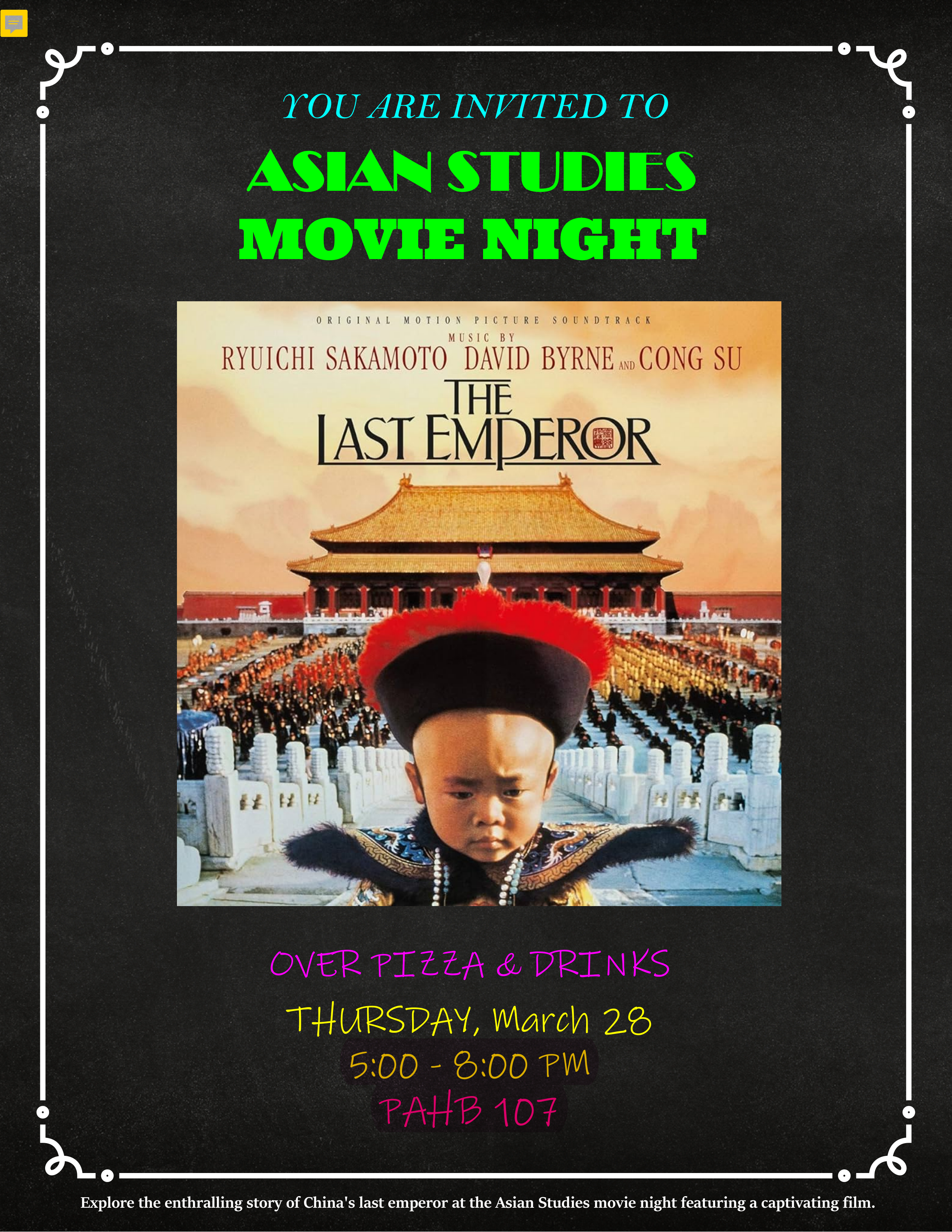 Join Asian Studies for a screening of the Academy Award-winning Best Picture The Last Emperor! This 1987 masterpiece tells the story of China's last emperor, Puyi, and is based on his autobiography.