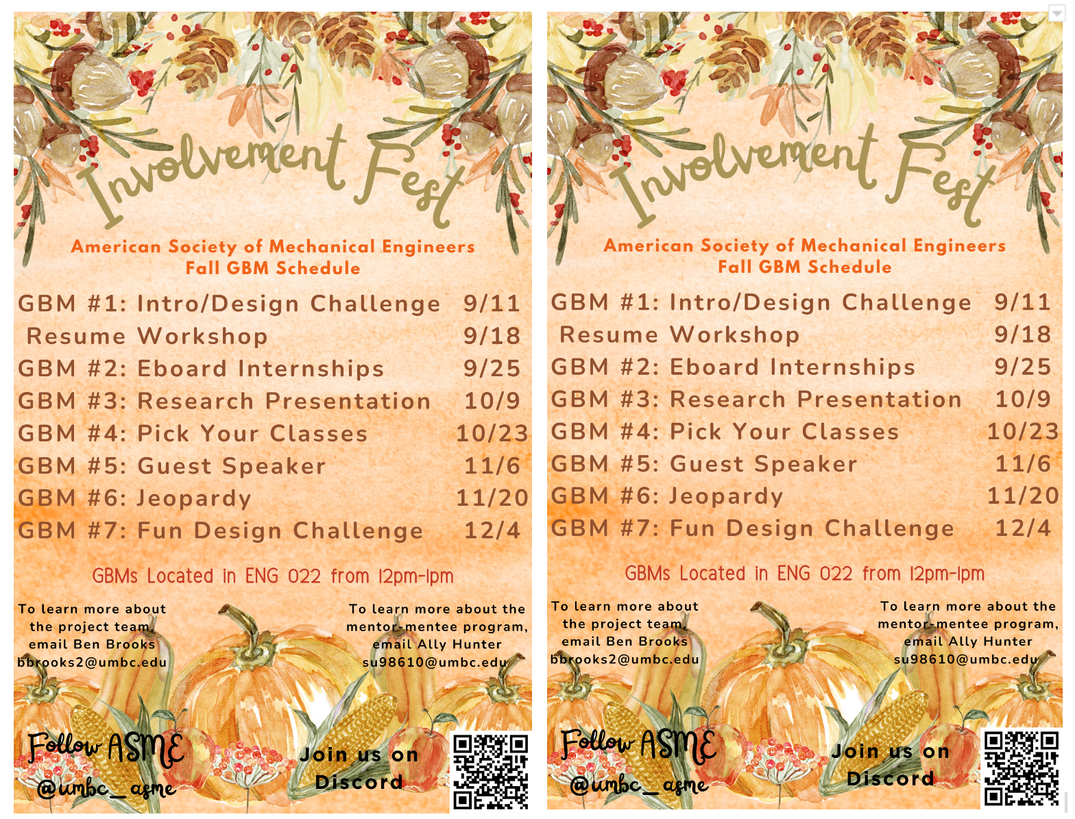 Find us at Involvement Fest this Wednesday 9/6/23! Take the opportunity to meet current ASME members and sign up to become one yourself. Joining ASME is a great opportunity for students to get involved on campus and connect with fellow mechanical engineering majors. We are looking forward to seeing you there!