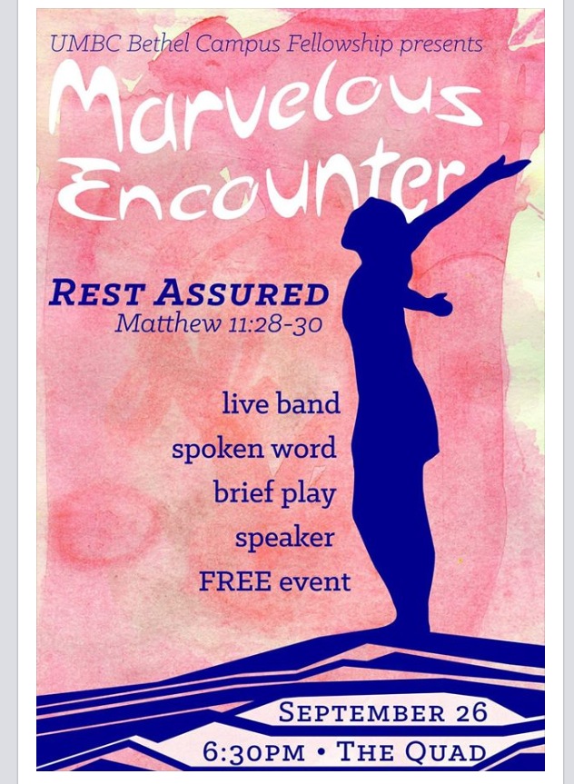 We will have a live band, brief play, spoken word and a speaker. Everyone is invited. Bring your friends. Come expecting. God wants to do a glorious thing at UMBC.