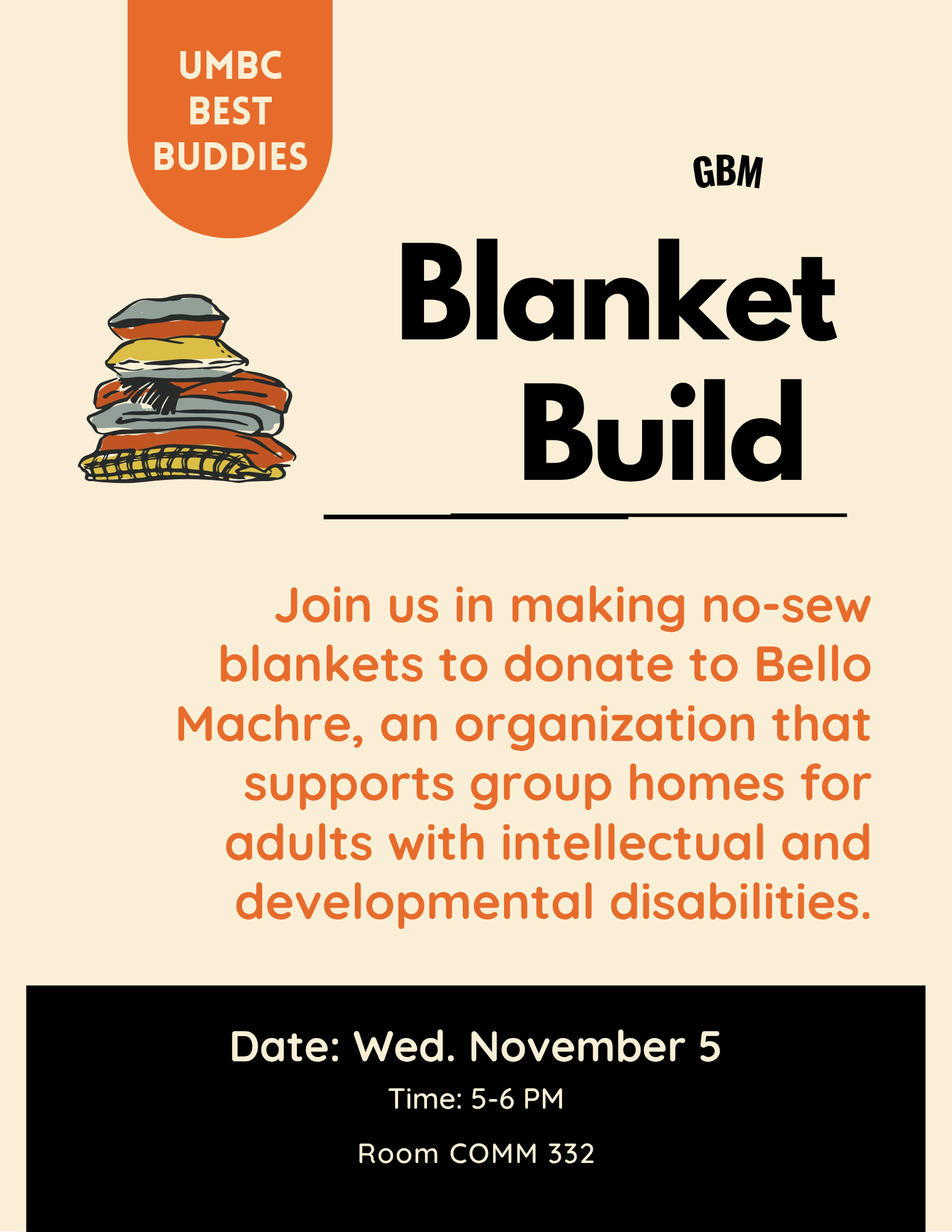 Join UMBC Best Buddies on Wednesday 11/5 from 5-6 PM in COMM 332 to make no-sew blankets for donation!