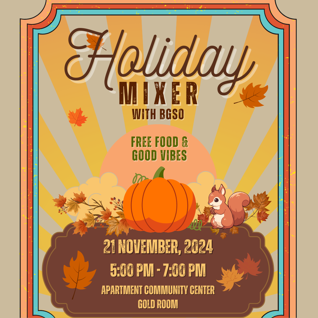 Come through Thursday, November 21st from 5-7pm in the Apartment Community Center Gold Room, for some good food and good company! This is a great opportunity to unwind from the stress of finals, relax, and socialize with Black graduate students, faculty, and staff.