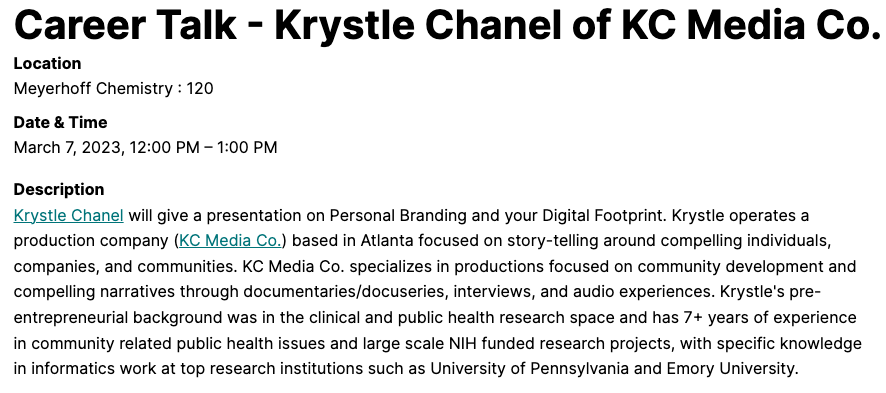 Please join G-Rise on, Tuesday, March 7, 2023 at 12:00 noon in CHEM 120, for a presentation by Krystle Chanel of KC Media on Personal Branding and your Digital Footprint.