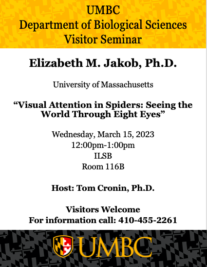 Please join the Department of Biological Sciences, and host Dr. Thomas Cronin for a seminar given by Dr. Elizabeth Jakob from The University of Massachusetts. Dr. Jakob will be presenting, "Visual Attention in Spiders: Seeing the World Through Eight Eyes".