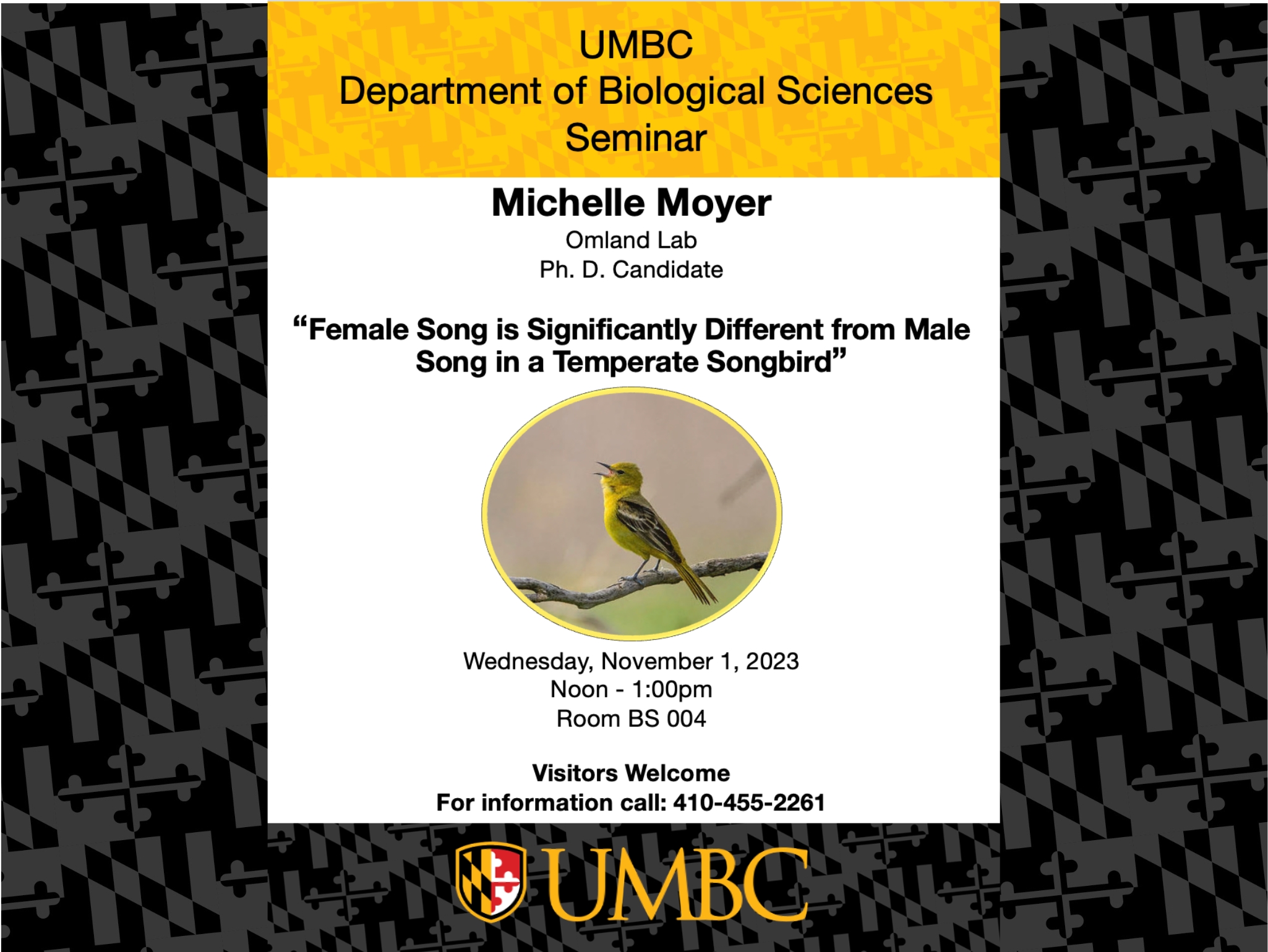 Please join us in BS 004 from 12-1pm for a 5-Year Talk presented by Michelle Moyer, one of our Ph.D. candidates in Dr. Kevin Omland's lab.