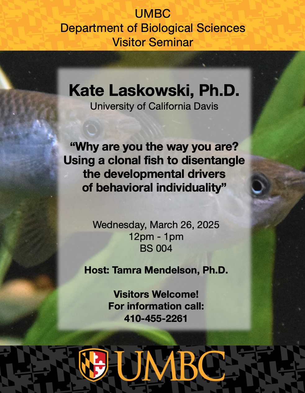 Dr. Laskowski will be presenting, “Why are you the way you are? Using a clonal fish to disentangle the developmental drivers of behavioral individuality”.