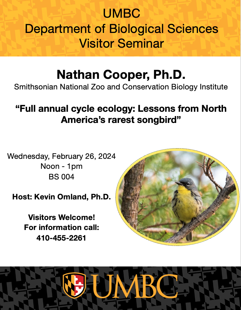 Please join the Department of Biological Sciences, and host Dr. Kevin Omland in BS 004 for a seminar given by Dr. Nathan Cooper of the Smithsonian National Zoo and Conservation Biology Institute.