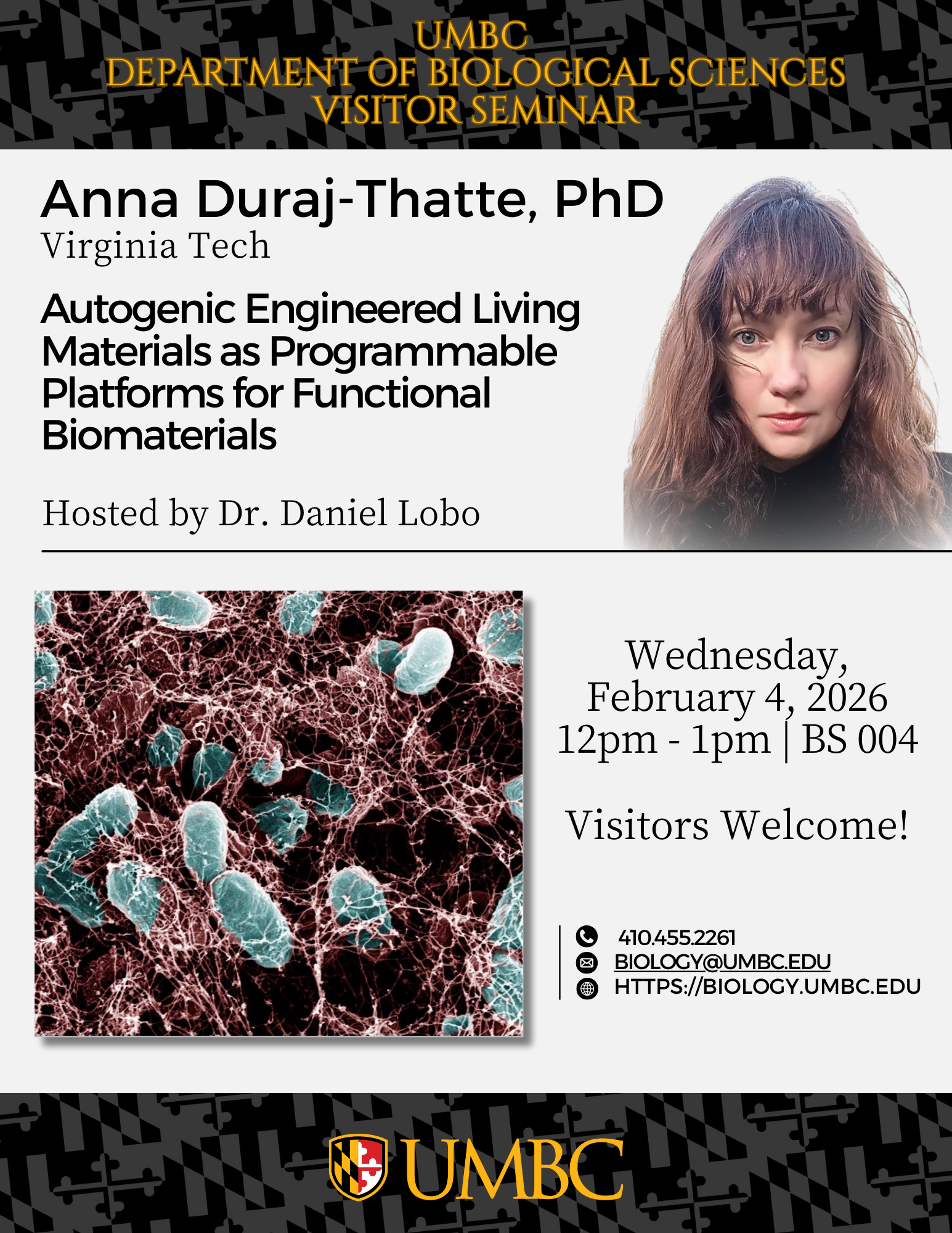Please join the Department of Biological Sciences along with host Dr. Daniel Lobo, for a seminar given by Anna Duraj-Thatte, PhD, from Virginia Tech.