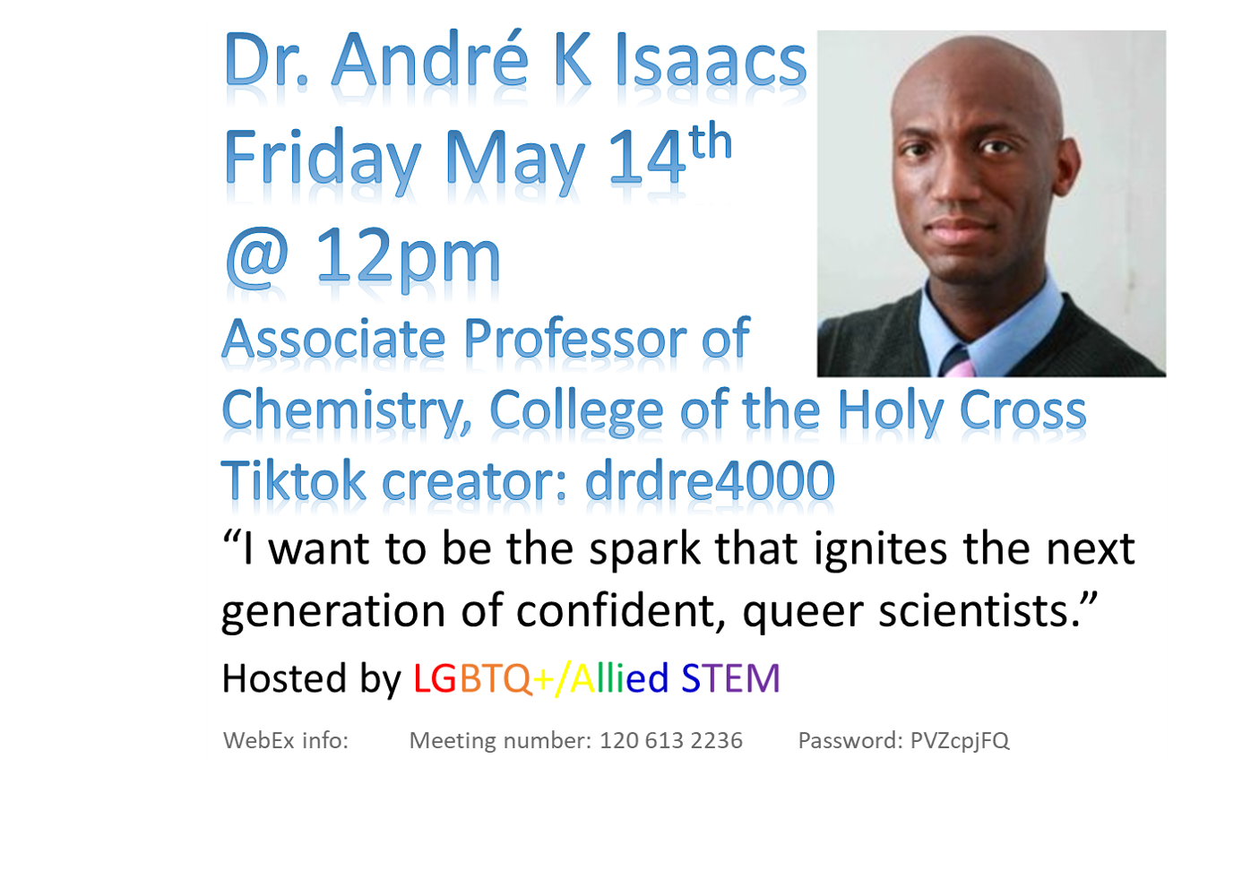 Please join the UMBC LGBTQ+/Allied STEM group as they invite Dr. André K Isaacs, Associate Professor of Chemistry, College of the Holy Cross to speak on May 14th at noon. "I want to be the spark that ignites the next generation of confident, queer scientists."