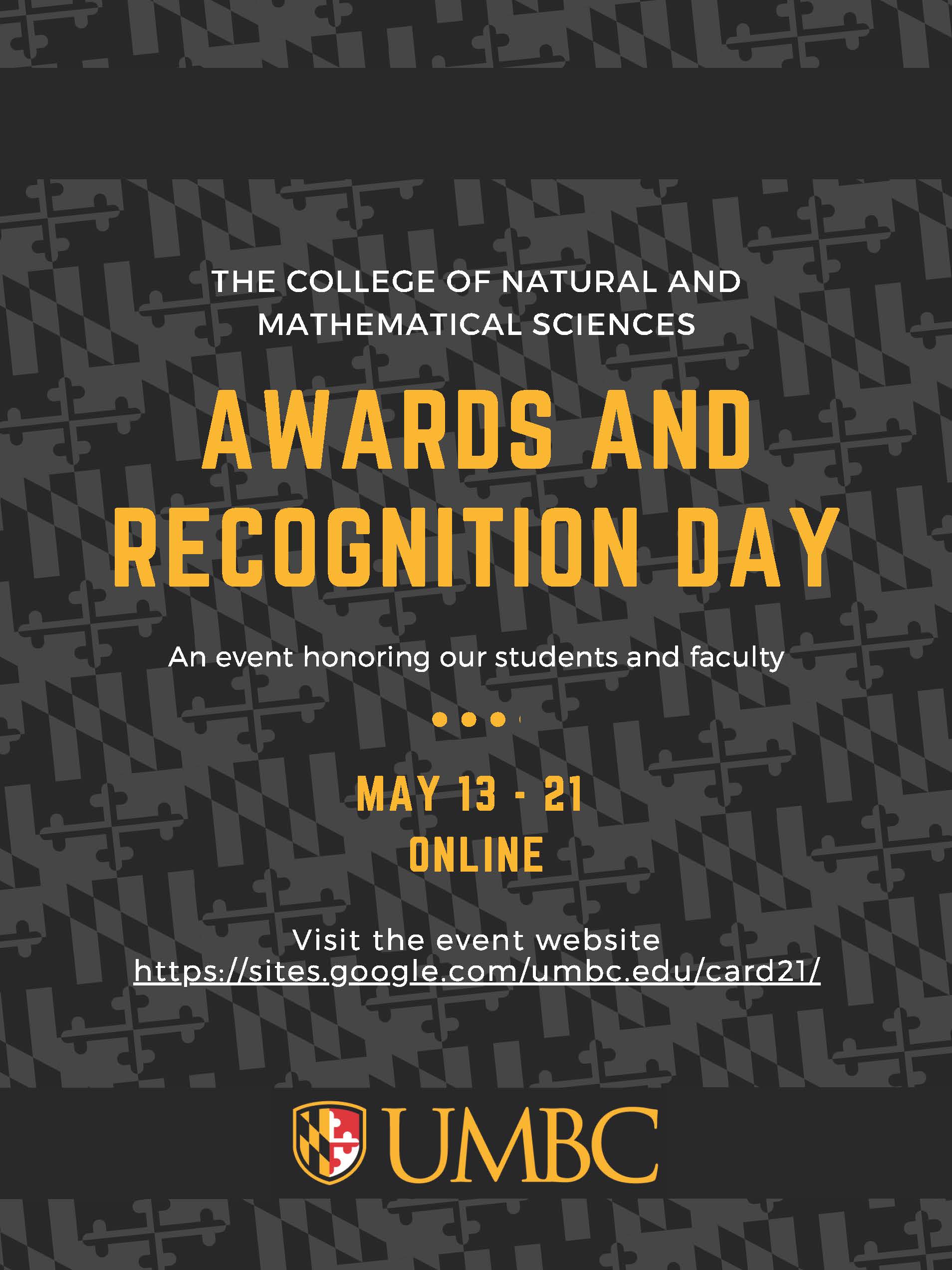 Please join us in congratulating all of our award recipients for the CNMS Awards and Recognition Day. Visit https://sites.google.com/umbc.edu/card21/ to see the full list of awardees.