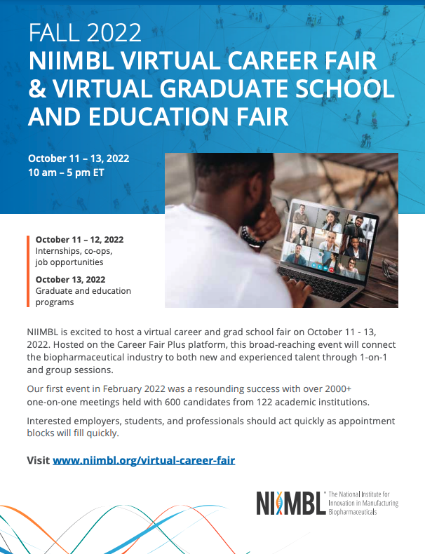 Attention students and prospective graduate students and job seekers! The National Institute for Innovation in Manufacturing Biopharmaceuticals (NIIMBL) is excited to host a virtual career fair & graduate school and education fair October 11-13, 2022!