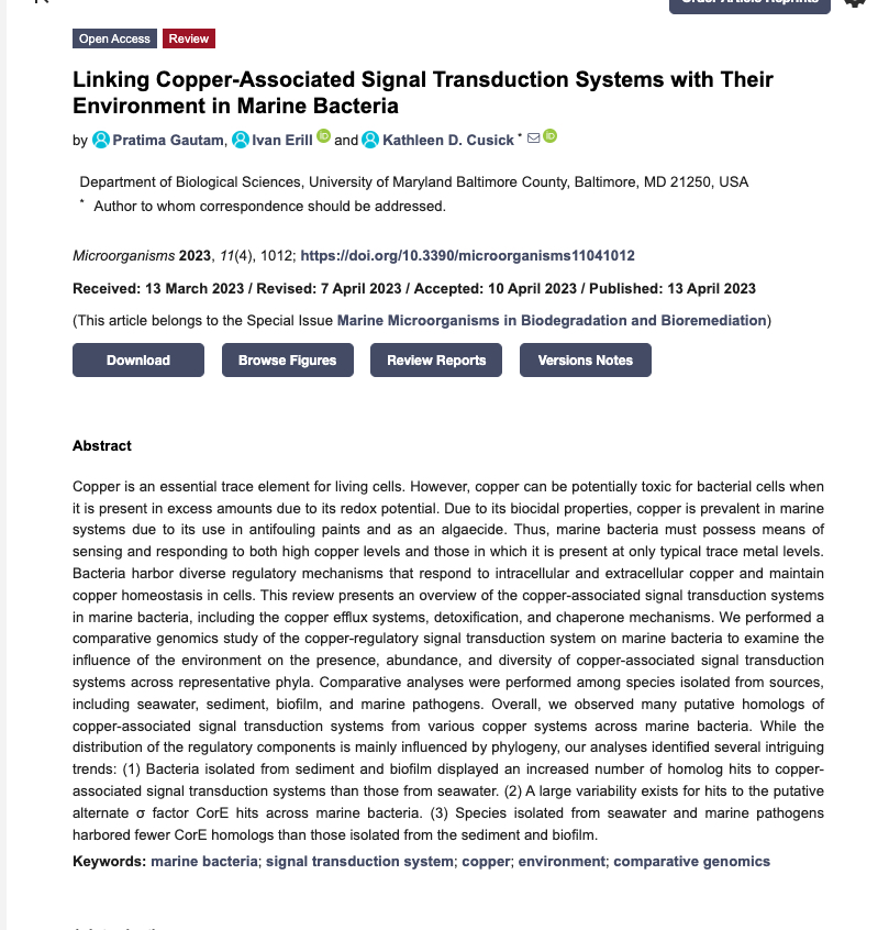 It will be published in the journal Microorganisms, and is titled "Linking Copper-Associated Signal Transduction Systems with Their Environment in Marine Bacteria".