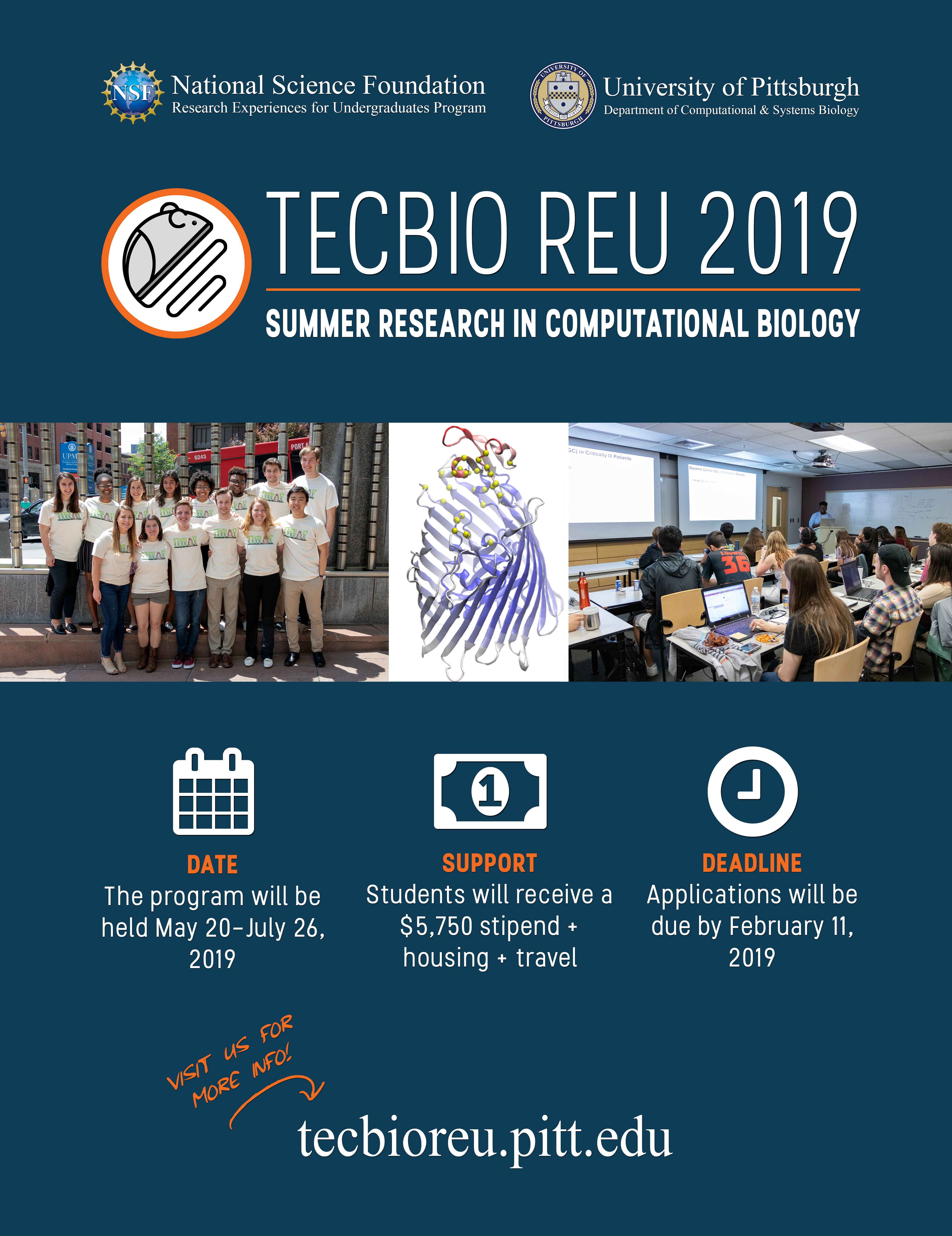 Applications are now open for the TECBio REU at the University of Pittsburgh. This 10-week computational biology program provides a challenging graduate-level research experience in computational biology. In addition to performing cutting-edge research, TECBio students will also participate in other academic activities, such as classes, seminars, and discussions, while experiencing the various social and cultural activities available in Pittsburgh.