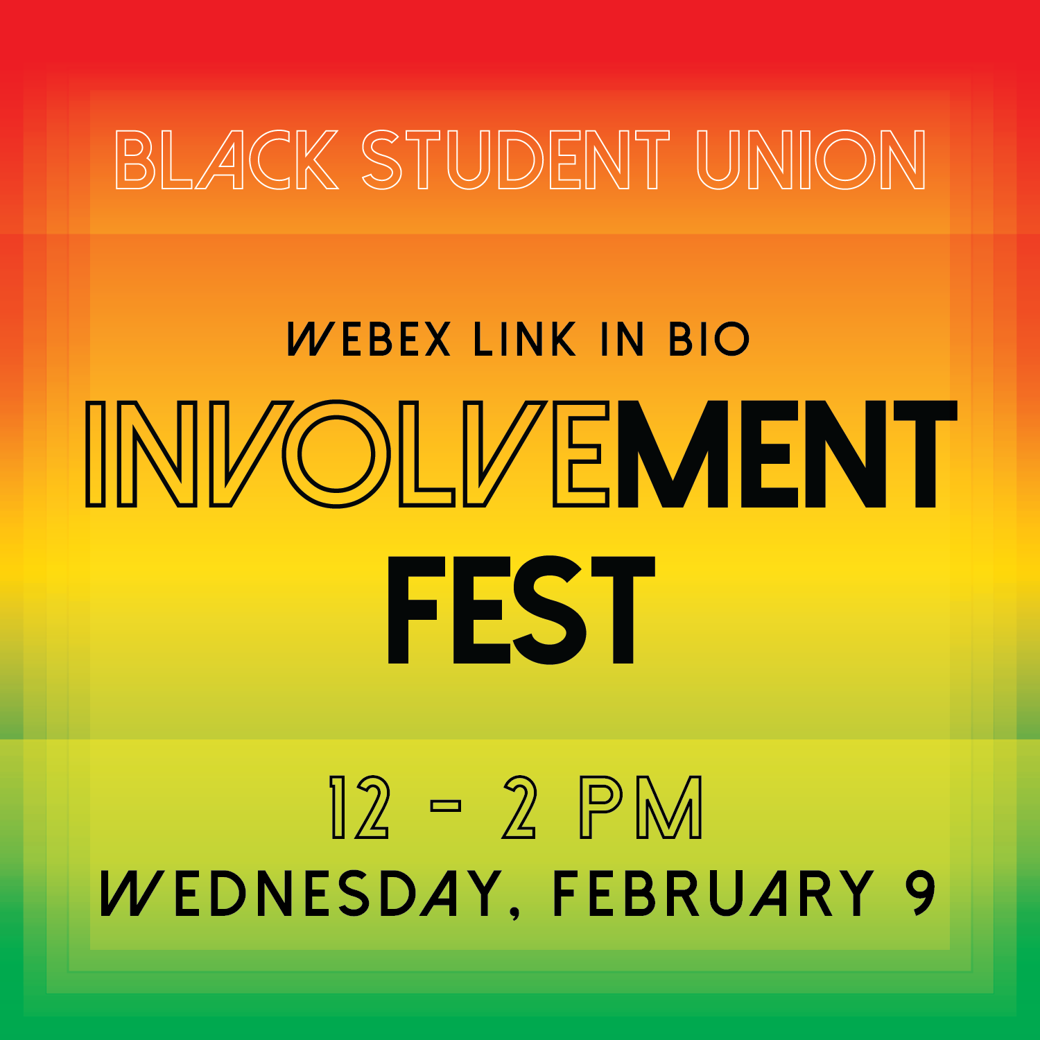 Good morning everyone, BSU Involvement Fest will be at Today, February 9, 12-2PM on Webex! Be sure to attend!
