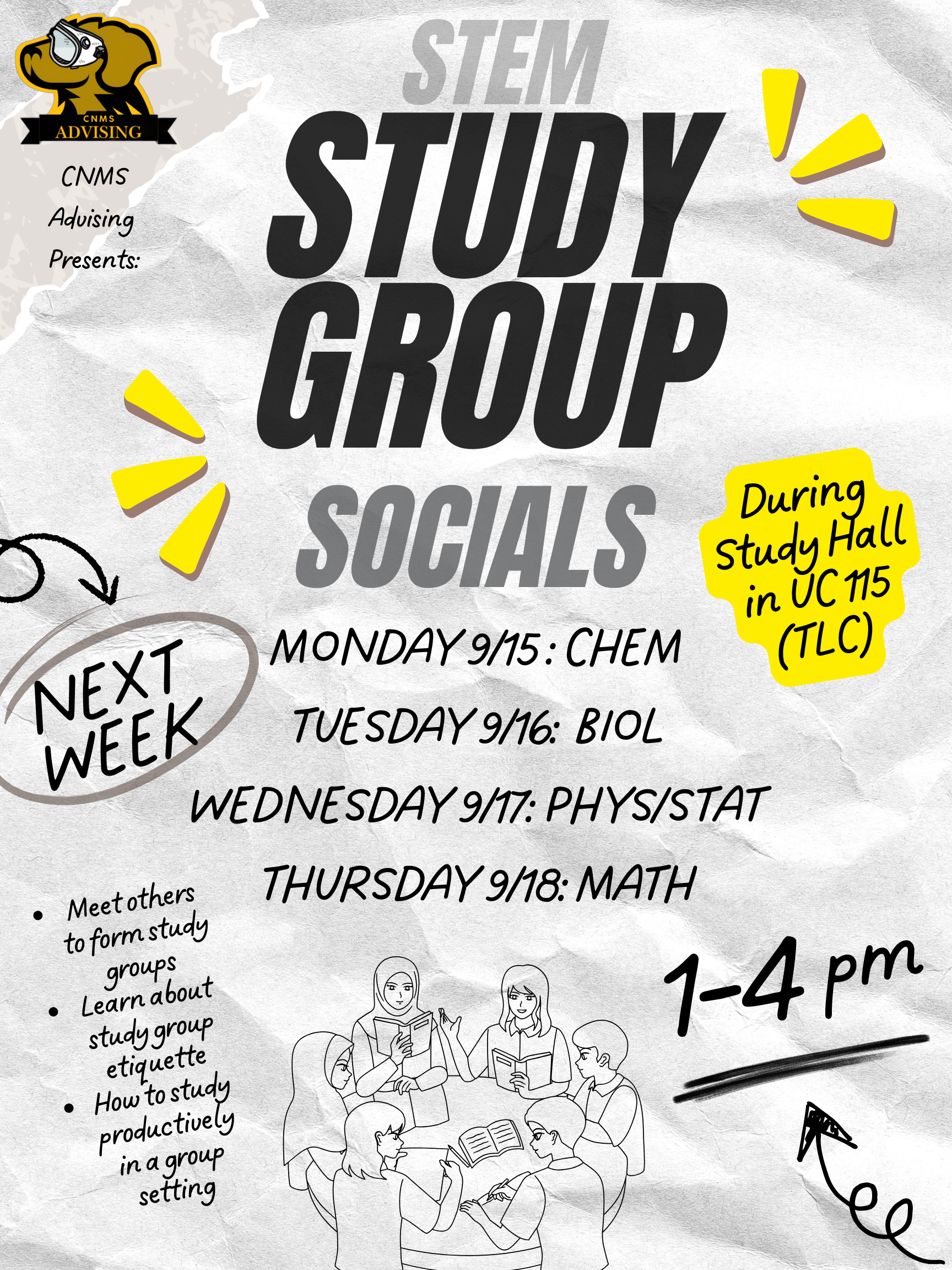 Next week in The Learning Collaboratory – TLC (UC115) from 1-4PM, we'll be holding Study Group Socials. Come in any time we're open (schedule posted below) and meet others in your class, grab a snack, and sign up for a study group!