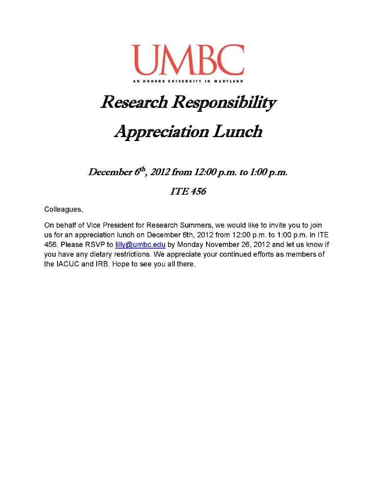 For members of our IACUC and IRB, on behalf of Vice President for Research Summers, we would like to invite you to join us for an appreciation lunch on December 6th, 2012 from 12:00 p.m. to 1:00 p.m. in ITE 456. Please RSVP to lilly@umbc.edu by Monday November 26, 2012 and let us know if you have any dietary restrictions. Hope to see you all there.