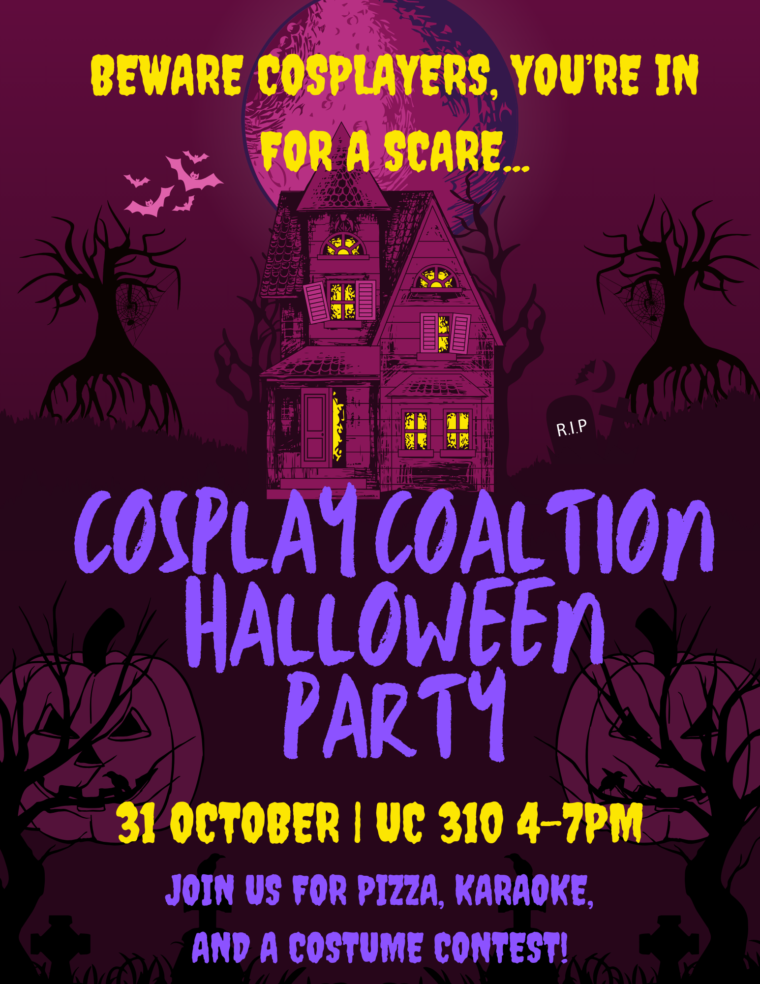 Come on down to Room 310 in the University Center... IF YOU DARE! For a Halloween Party to end all Halloween parties! We'll be having pizza, karaoke, and a costume party from 4-7PM! Show off your best cosplays and stay for some treats! We hope to see you there!