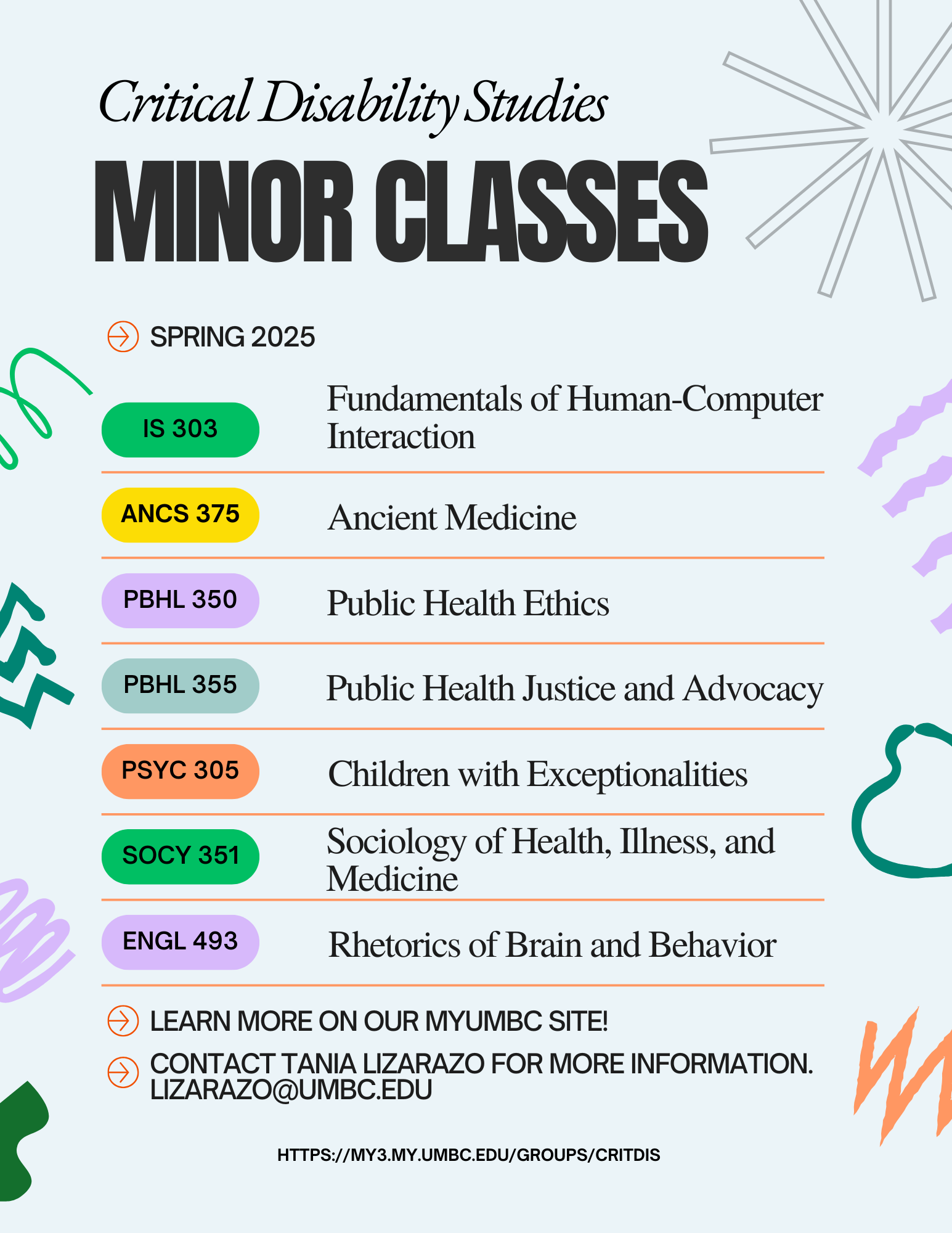This spring semester the Critical Disability Studies Minor is offering 8 different classes! 1 core class for the minor, 6 electives, and 1 additional course that is recommended. Check them out below.