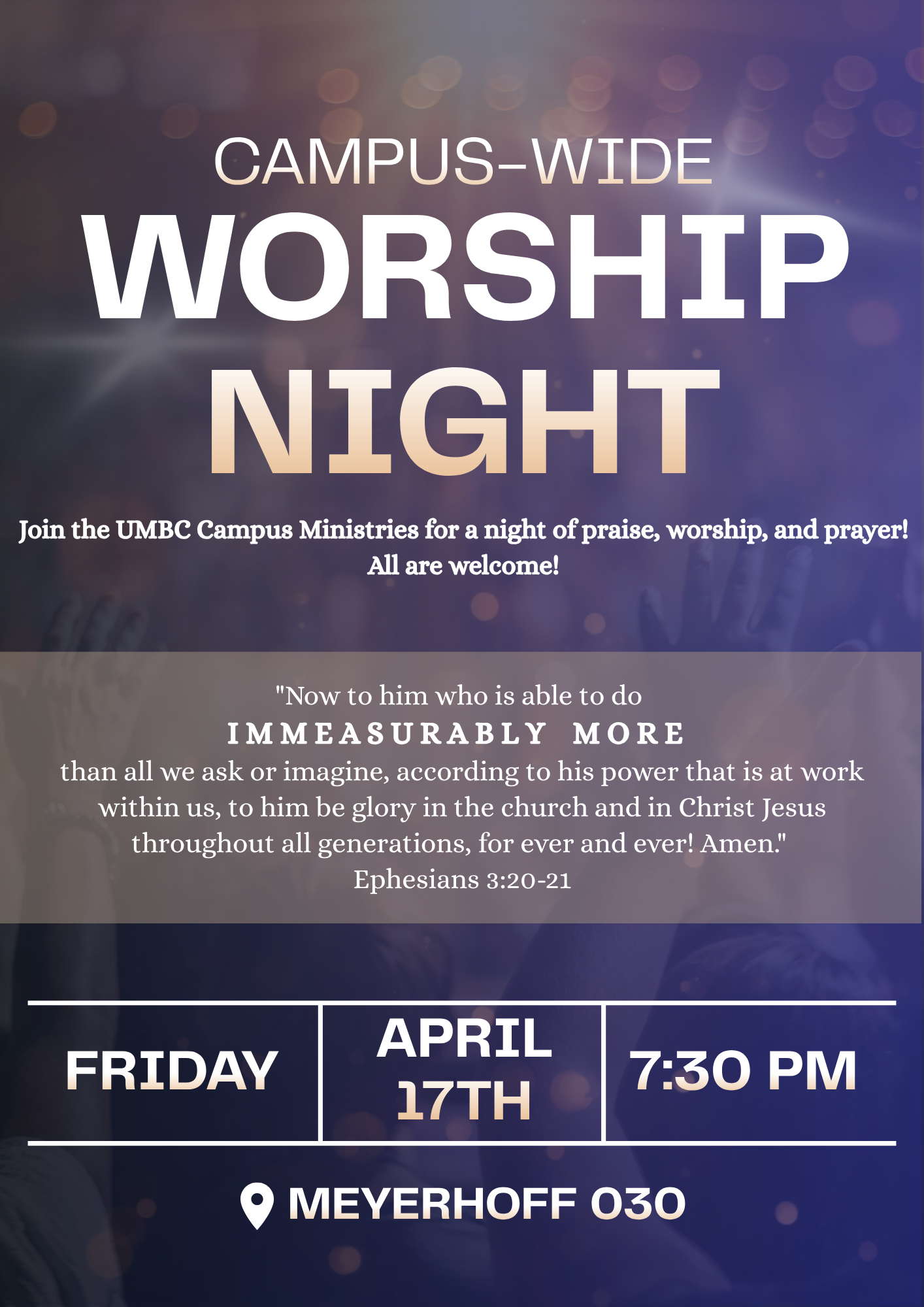 Hey Everyone!!! Friday Night 4/17 There will be a campus wide Worship Night! We want all of the Christian Orgs on campus to come together into one room and lift up our praises with one voice! Weather you are part of a christian org on campus or you just want to stop in and worship, stop into Meyerhoff 030 from 7:30 to 9:30 for a united night of worship!!! This is a great way for all of the Orgs on campus to meet and and make connections, not to mention a place where friends can be made and most of all we can praise the Lord together. I can't wait to see all of you there :)