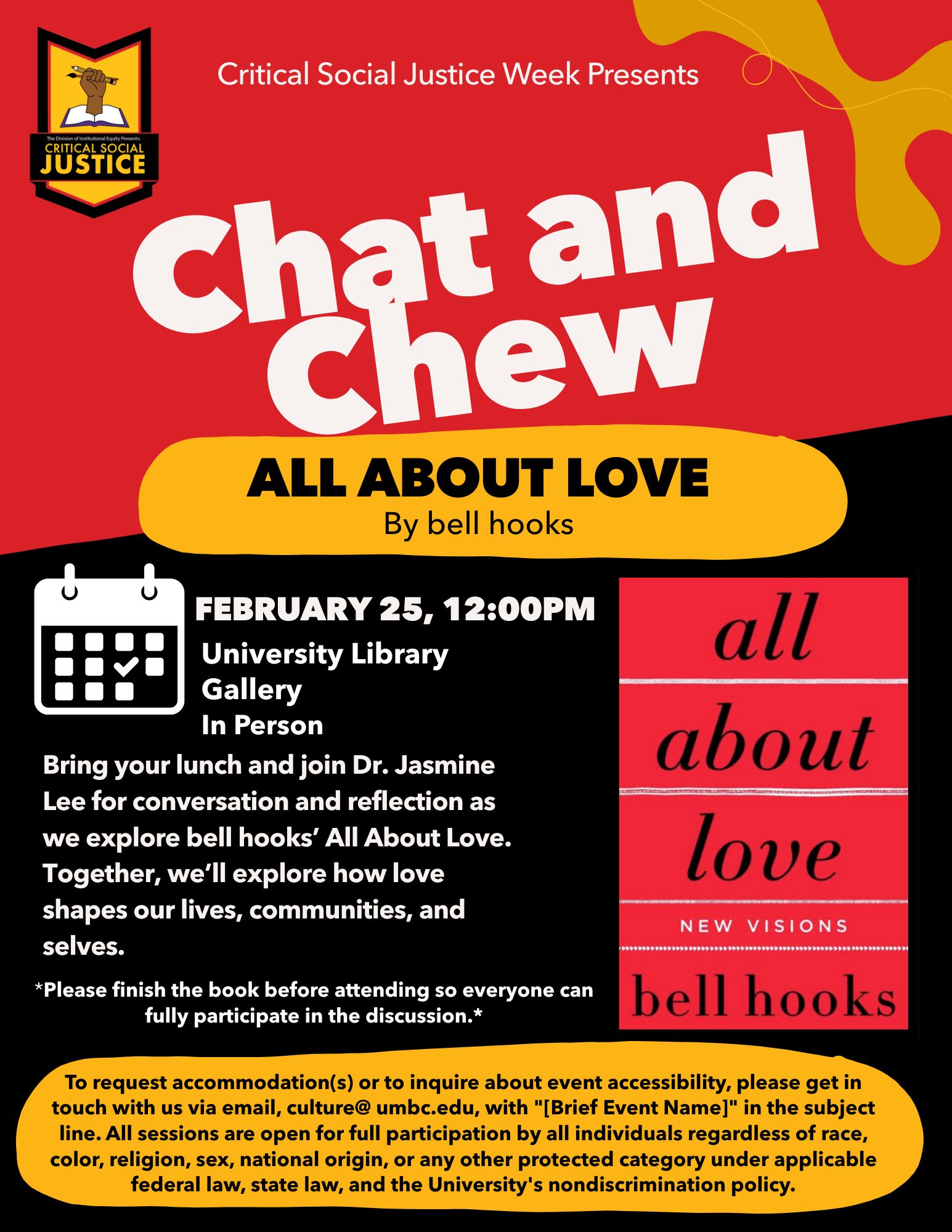 To wrap up our Critical Social Justice programming, join us to discuss All About Love by bell hooks with Dr. Jasmine Lee. Bring your lunch and be ready to build community with one another! We will explore how love shapes our lives, communities and selves.