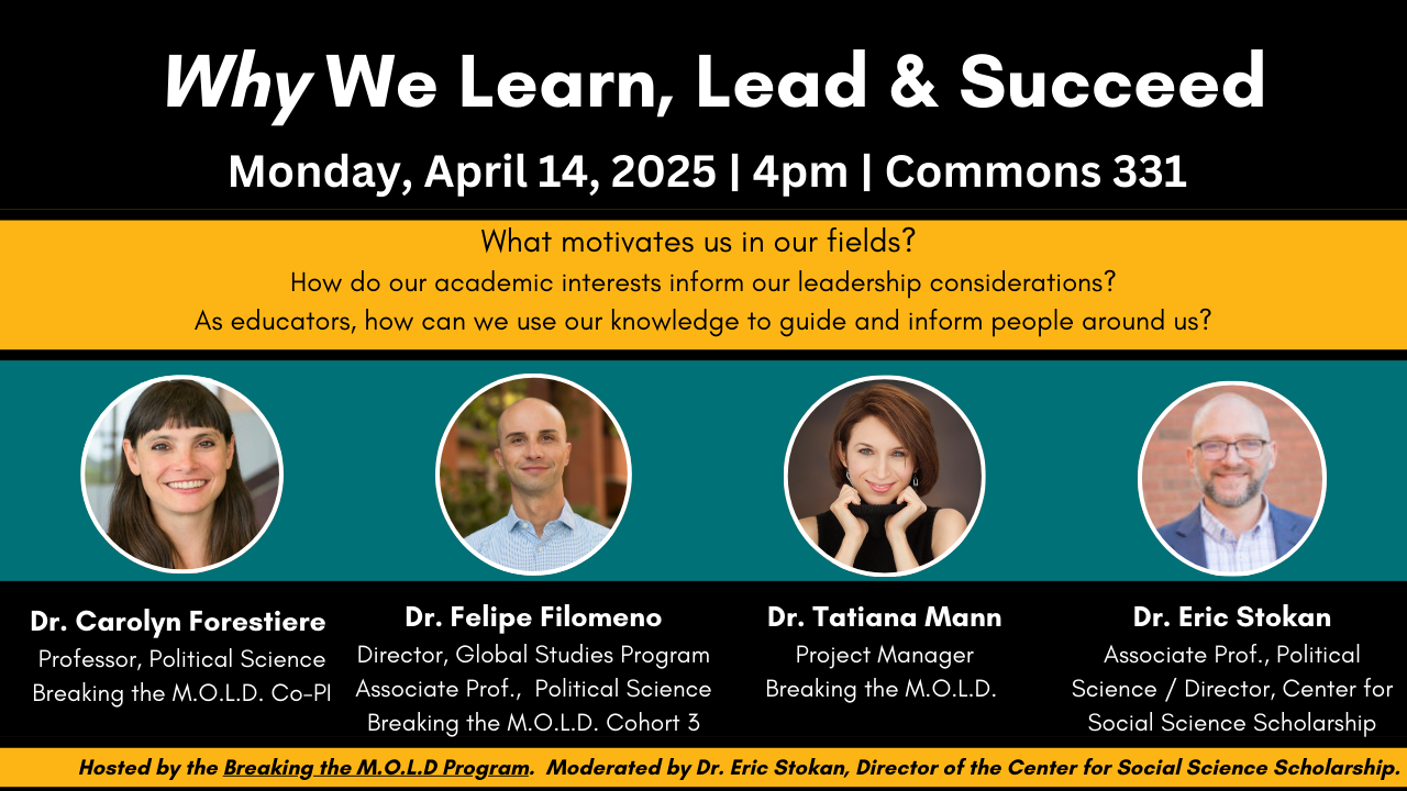 Hosted by the Breaking the M.O.L.D. Program. Moderated by Dr. Eric Stokan, Director of the Center for Social Science Scholarship, a cosponsor.