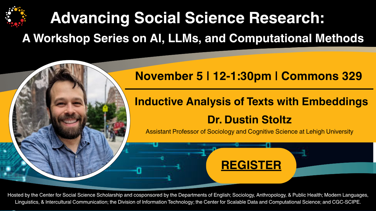 Hosted by the Center for Social Science Scholarship and cosponsored by the Departments of English; Sociology, Anthropology, & Public Health; Modern Languages, Linguistics, & Intercultural Communication; the Division of Information Technology; the Center for Scalable Data and Computational Science; and CGC-SCIPE.