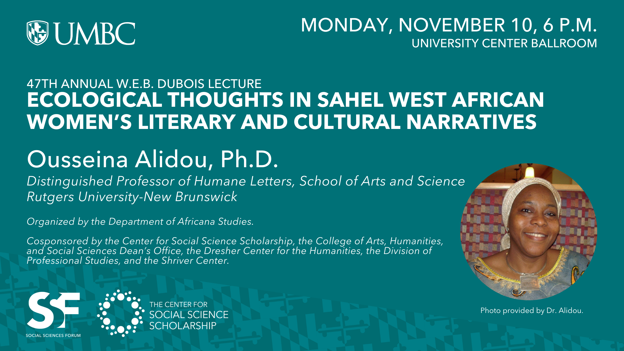 In the 47th Annual W. E. B. Du Bois Distinguished Lecture, Alidou examines life and being human in West African Sahel women's ecological thoughts as articulated in their literary and cultural narratives. Alidou's aim is to expand our understanding of Sahelian women's enduring contributions to ethical engagement with environmental concerns and preservation, climate change, vulnerability, migration, gender equity, and resilience. She highlights comparative perspectives that can be drawn between the Sahel ecological thoughts and W.E.B Du Bois' sociological meditations on the intersection of race, class, gender, and environmental justice.