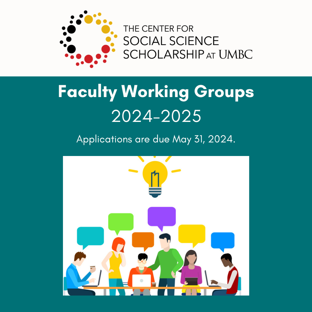 Up to four Faculty Working Groups will be selected by the center directors and advisory board members. Groups should be faculty-led and must include at least one faculty member from a social science department at UMBC. Additional priority will be given to groups whose members and/or areas of interest are multi- or interdisciplinary. Advanced graduate students may participate as Faculty Working Group members but may not serve as leaders.