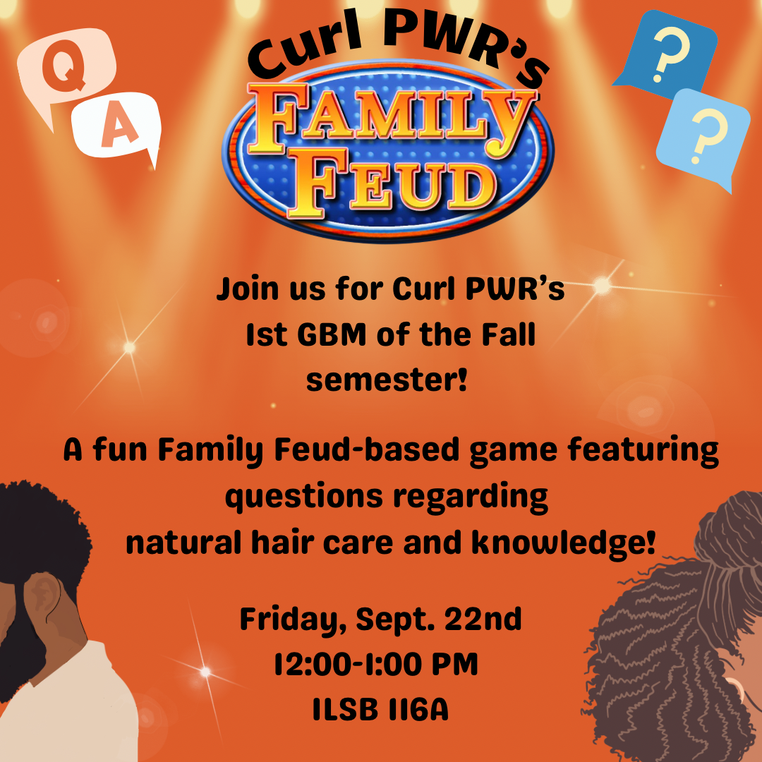 Welcome back, Curl PWR! We are so excited to announce our 1st GBM of the new semester: Family Feud! We love a good game-based activity so we’re pulling out the natural hair care questions to test your knowledge! Make sure to pop out on Friday at 12PM in ILSB 116A and bring a friend too! See you then!