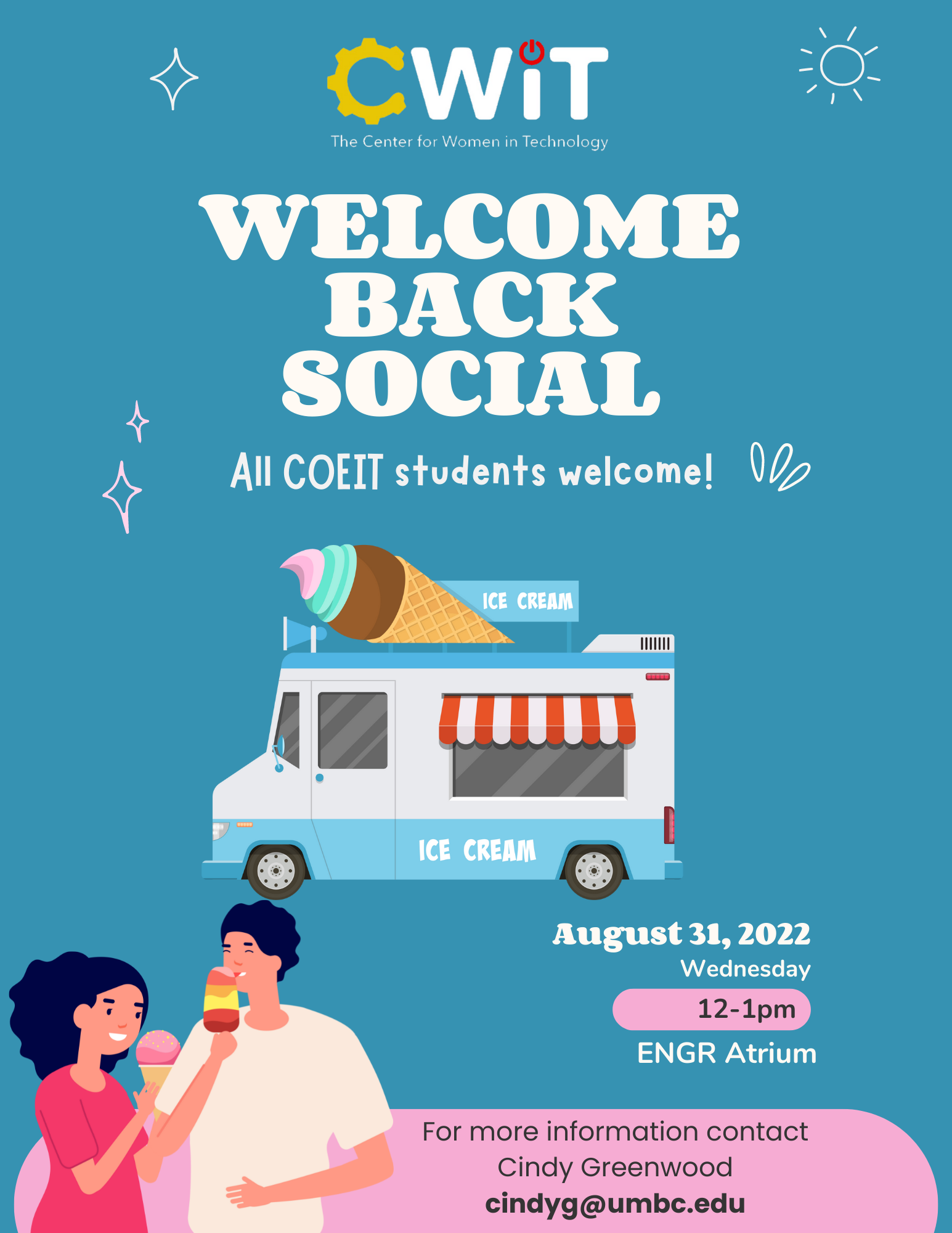 All COEIT students, faculty, and staff are invited to join CWIT in the Engineering Building Atrium for a Welcome Ice Cream Social on Wednesday, August 31, from 12-1pm. Stop by to mingle with others from the college and meet new people from your majors or departments. Non-dairy options will be available upon request while supplies last.