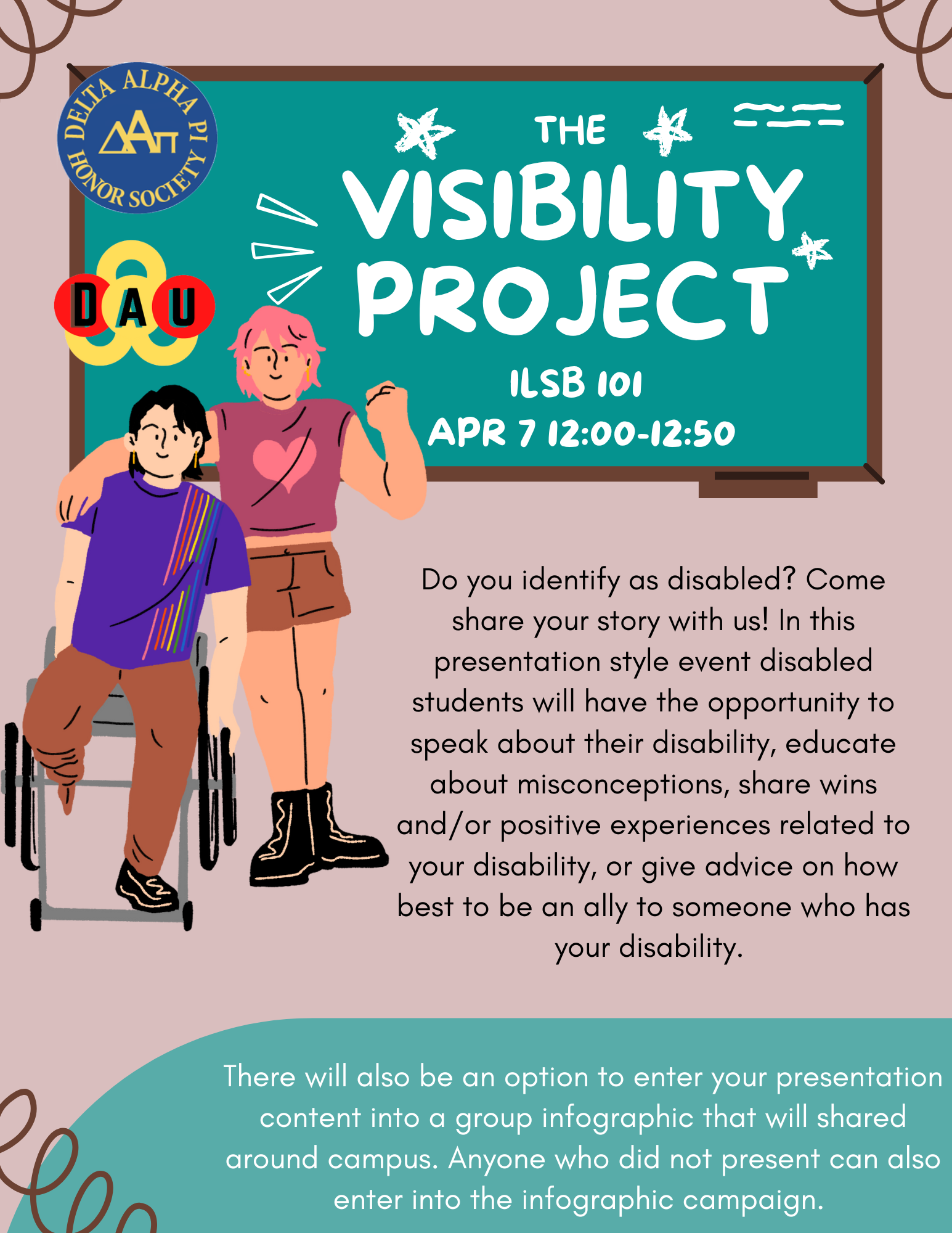 This event is a collaboration between the Disability Advocate Union (DAU) and the Delta Alpha Pi Honor Society (DAPi).