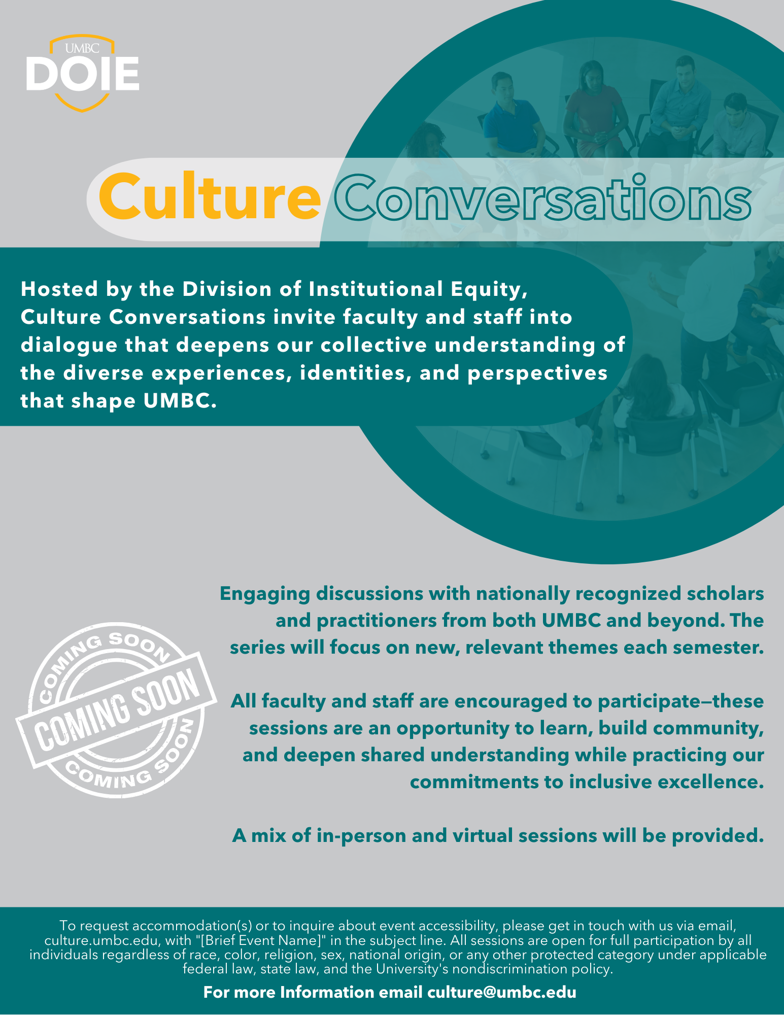 The Division of Institutional Equity is launching a new series titled "Culture Conversations"– a set of semesterly conversations that deepens our collective understanding of the diverse experiences, identities, and perspectives that shape UMBC. The series will focus on new, relevant themes each semester.