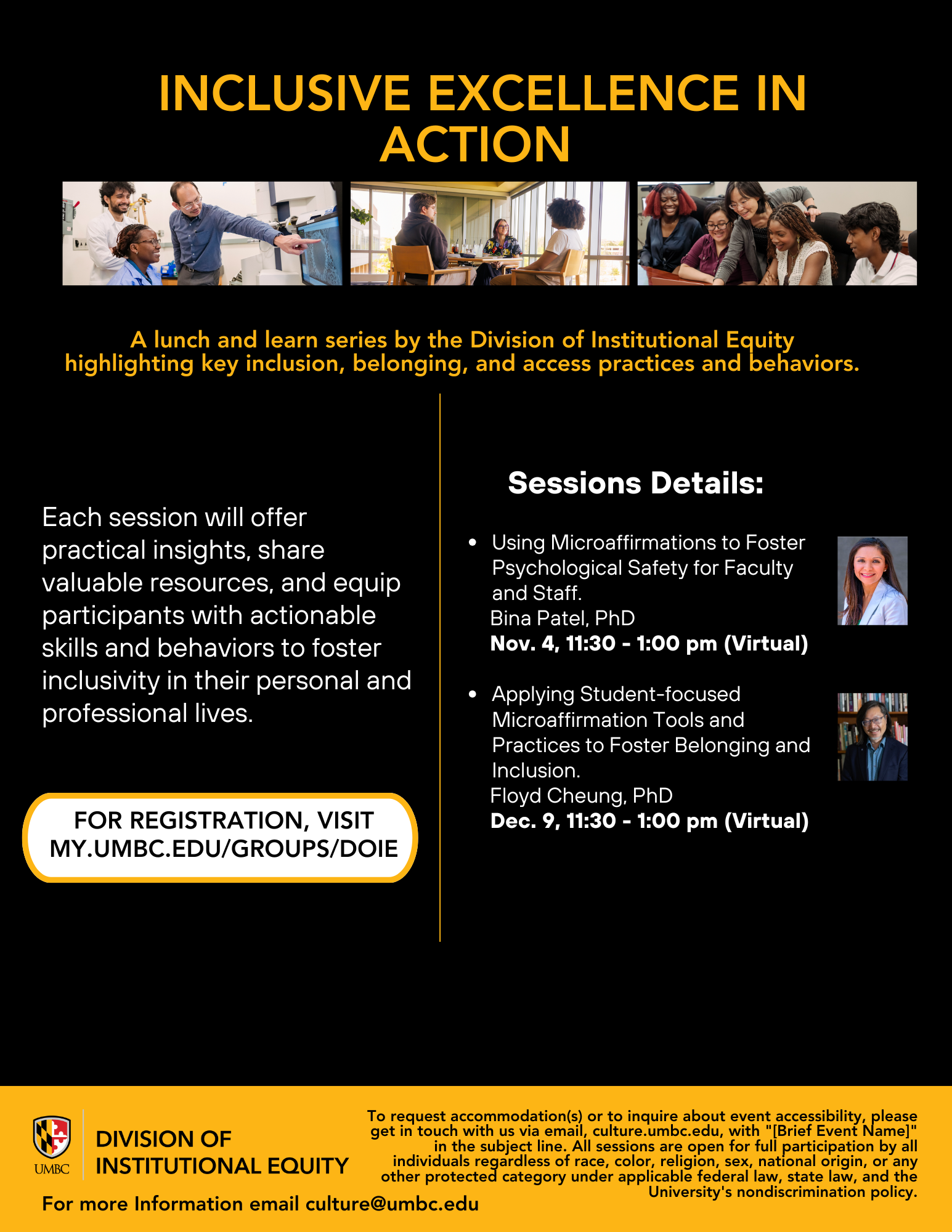 Join us for Inclusive Excellence in Action, a semesterly series highlighting key inclusion, belonging, access practices and behavior at UMBC. Each session will offer practical insights into the work in these areas, share valuable resources, and equip participants with actionable skills and behaviors to foster inclusivity in their personal and professional lives. This engaging series will inspire and empower our community to implement inclusive excellence daily.