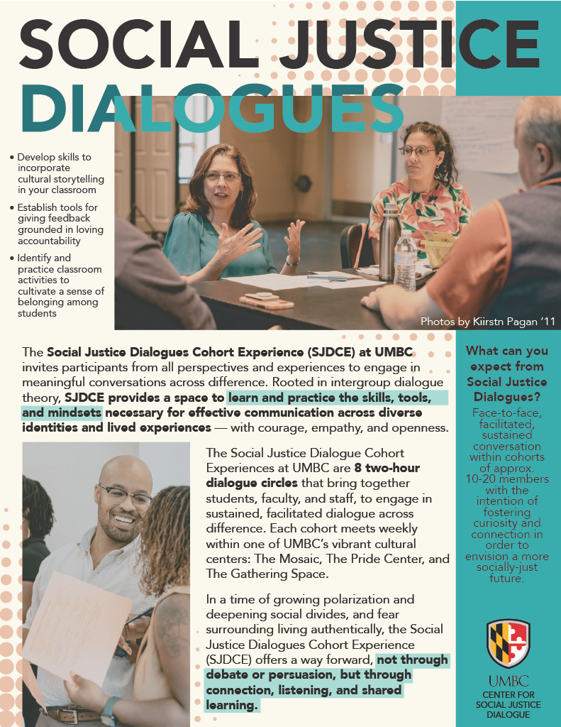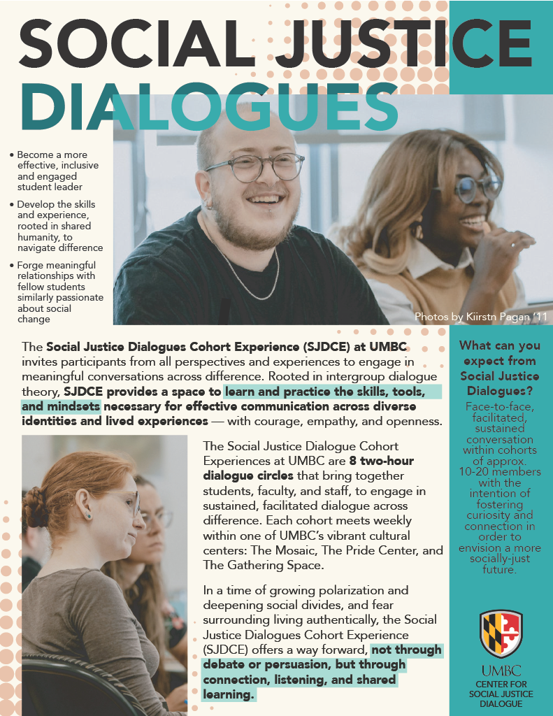 The Social Justice Dialogues Cohort Experience (SJDCE) at UMBC invites participants from all perspectives and experiences to engage in meaningful conversations across difference. Rooted in intergroup dialogue theory, SJDCE provides a space to learn and practice the skills, tools, and mindsets necessary for effective communication across diverse identities and lived experiences — with courage, empathy, and openness.