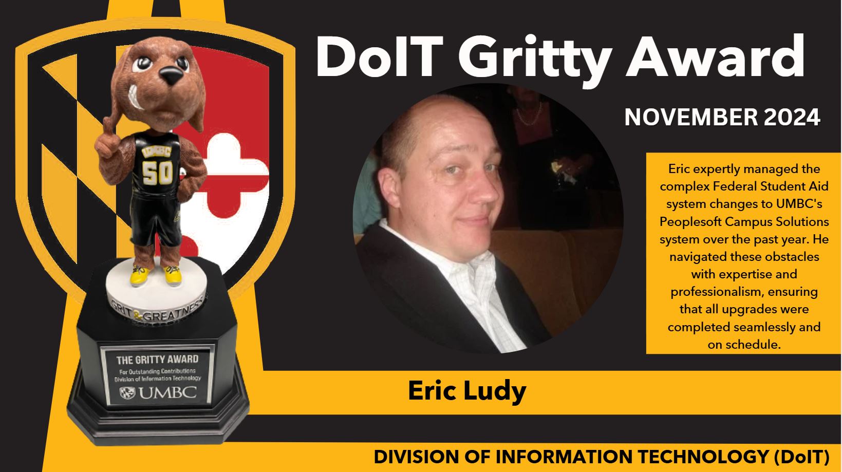 We are proud to announce that Eric Ludy has been awarded the DoIT Gritty Award for his exceptional work in managing the complex Federal Student Aid system changes to UMBC's Peoplesoft Campus Solutions system over the past year.
