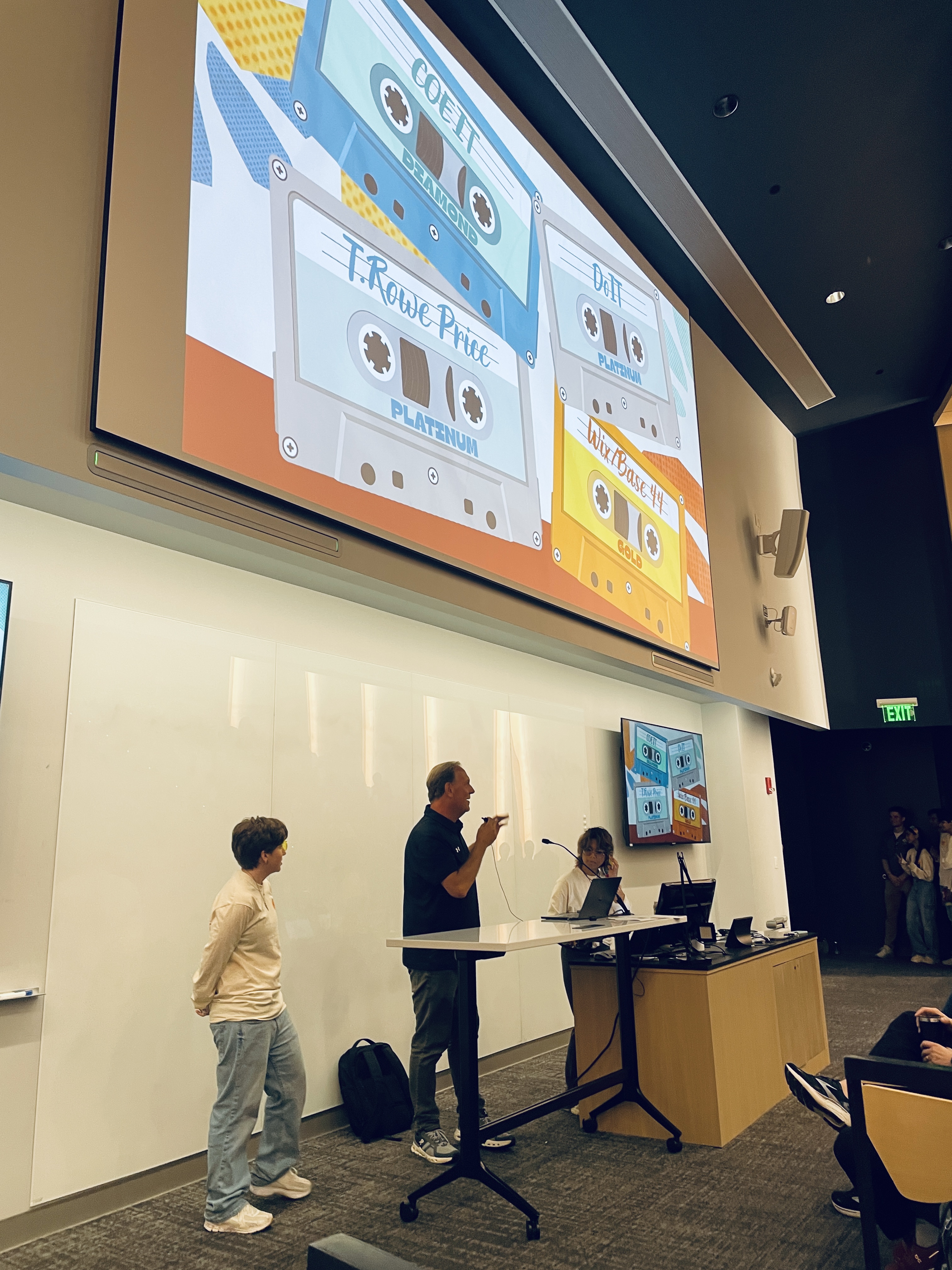 A group of people, including Jason Paluck, Todd Haddaway, Logan Montgomery, and Erica D'Eramo, worked hard to create the Data Science track. Jason came up with the highly detailed challenge, giving everyone data and great ideas. Todd was the superhero who stayed up until 2 a.m. on a Sunday morning to answer questions and help the students as they worked! Logan, who had been to hackUMBC before, gave the team tips on what the student hackers would need. Stacy Cahill, the Chief Information Security Officer, stopped by to cheer on the students!