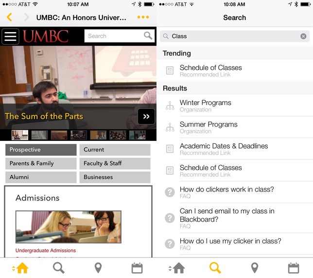 Search features an adaptive search engine, allowing for results from many UMBC sites such as the UMBC directory, groups, departments, and the UMBC FAQs. Collier Jones, lead architect for myUMBC, said “You don’t have to know what you are looking for, we’ll try to help [with universal searching]”