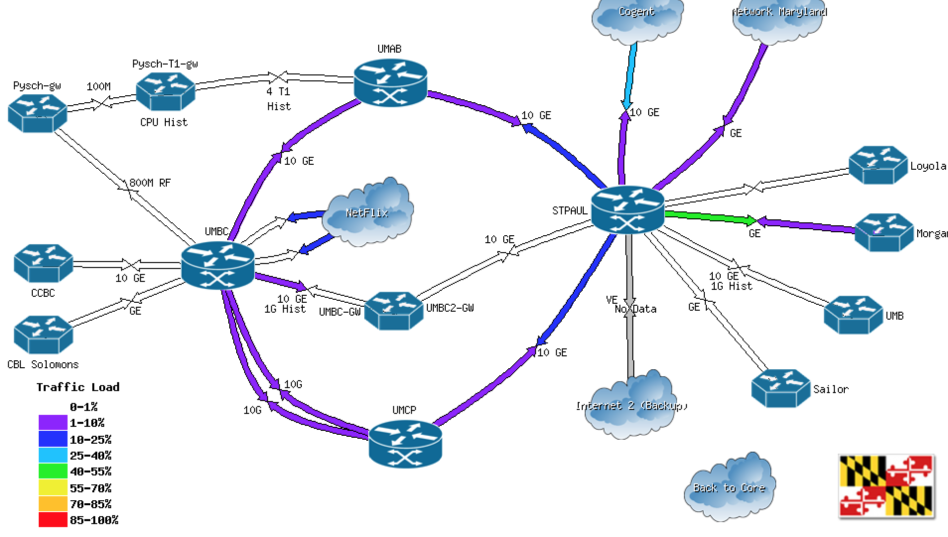 A network map that shows how UMBC is connected to the MDREN network. The streaming is outbound from the node toward the customer watching a stream. The node is physically on campus, but should be viewed as being on the MDREN network. You can view the bits per second here and hover over each path.
