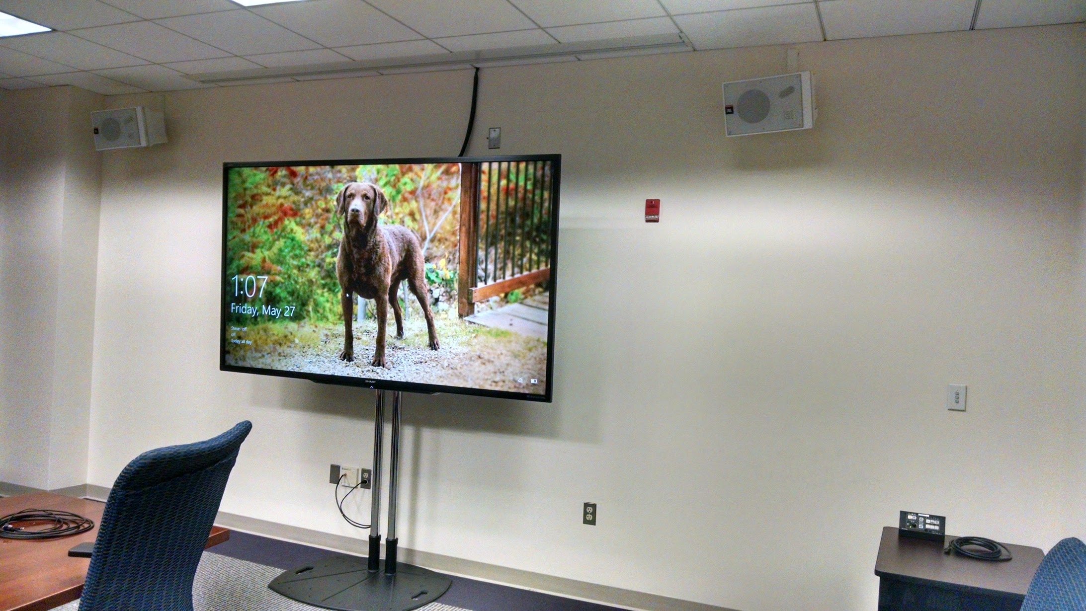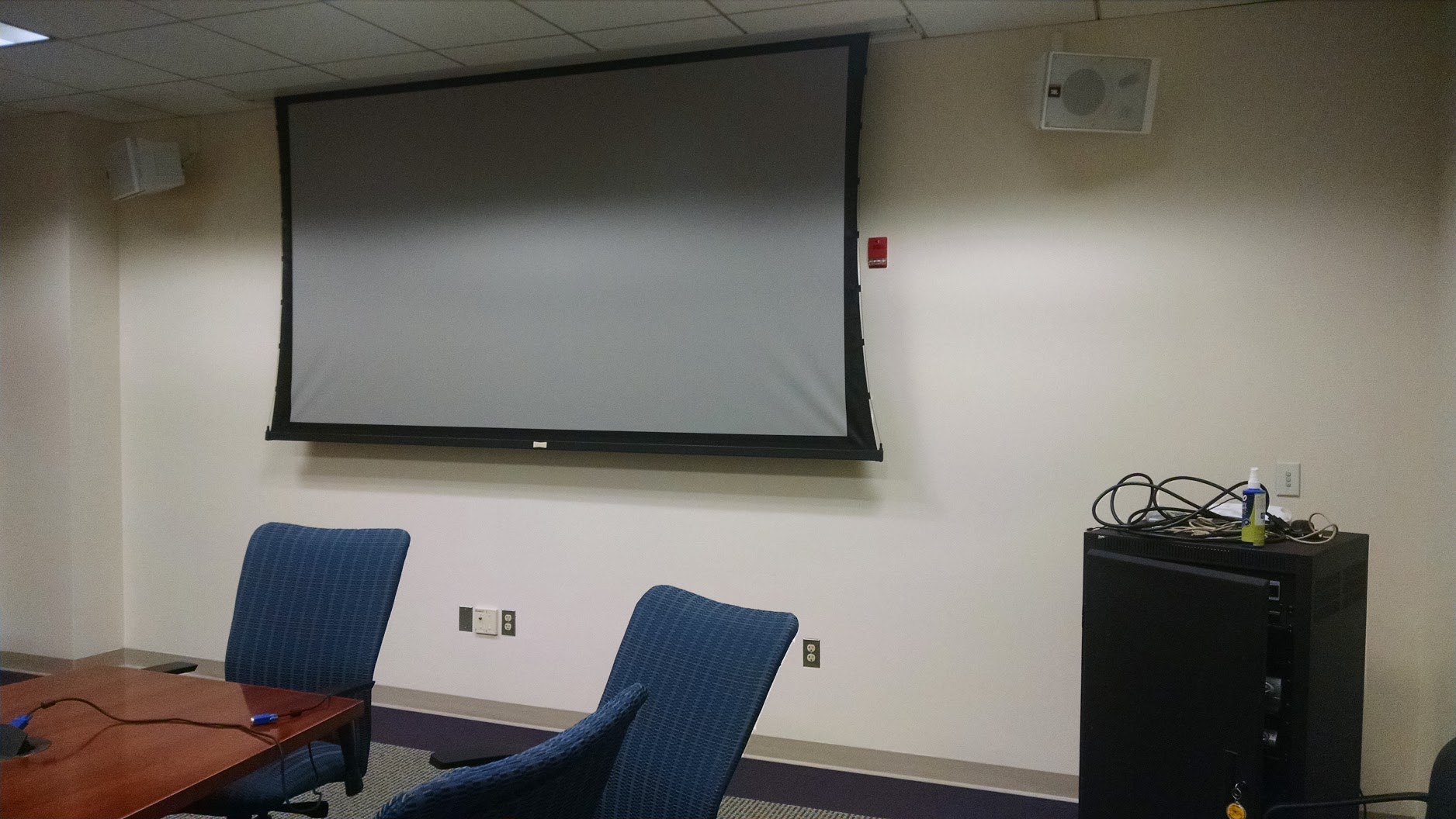Before AV Services stepped in, the room was just equipped with a dim projector along with a VGA input. Now, the room features a 90 inch HD television with easily accessible HDMI input, allowing for bright and crisp presentations. Older devices that connect to the TV have their signal upscaled thanks to a newly built in scaler, which helps with image clarity.