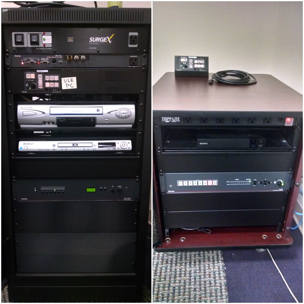 A before and after comparison in the AV rack changes. Gone are the VHS inputs and other older technology. Instead, the new, much shorter and more compact AV housing holds a blu Ray player, a built in scaler that up converts any non HDMI signal to 1080p, and controls mounted on the top of the housing for quick and easy access.