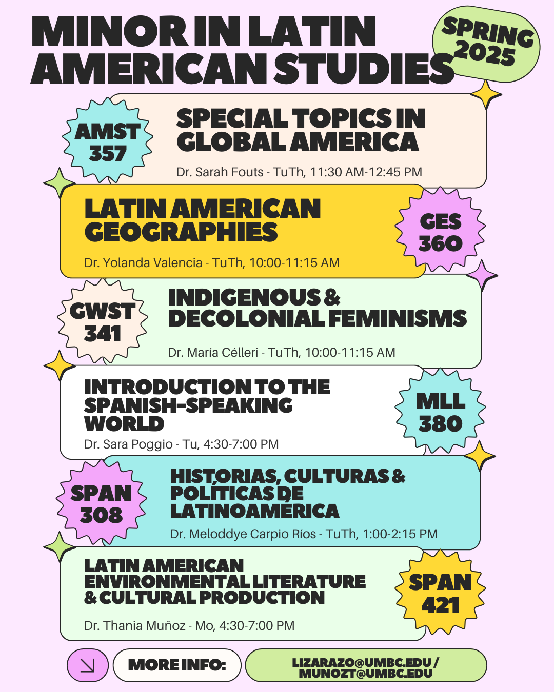 Fore more information, see the attached flyer below, visit the Latin American Studies minor website or contact lizarazo@umbc.edu / munozt@umbc.edu with any questions.