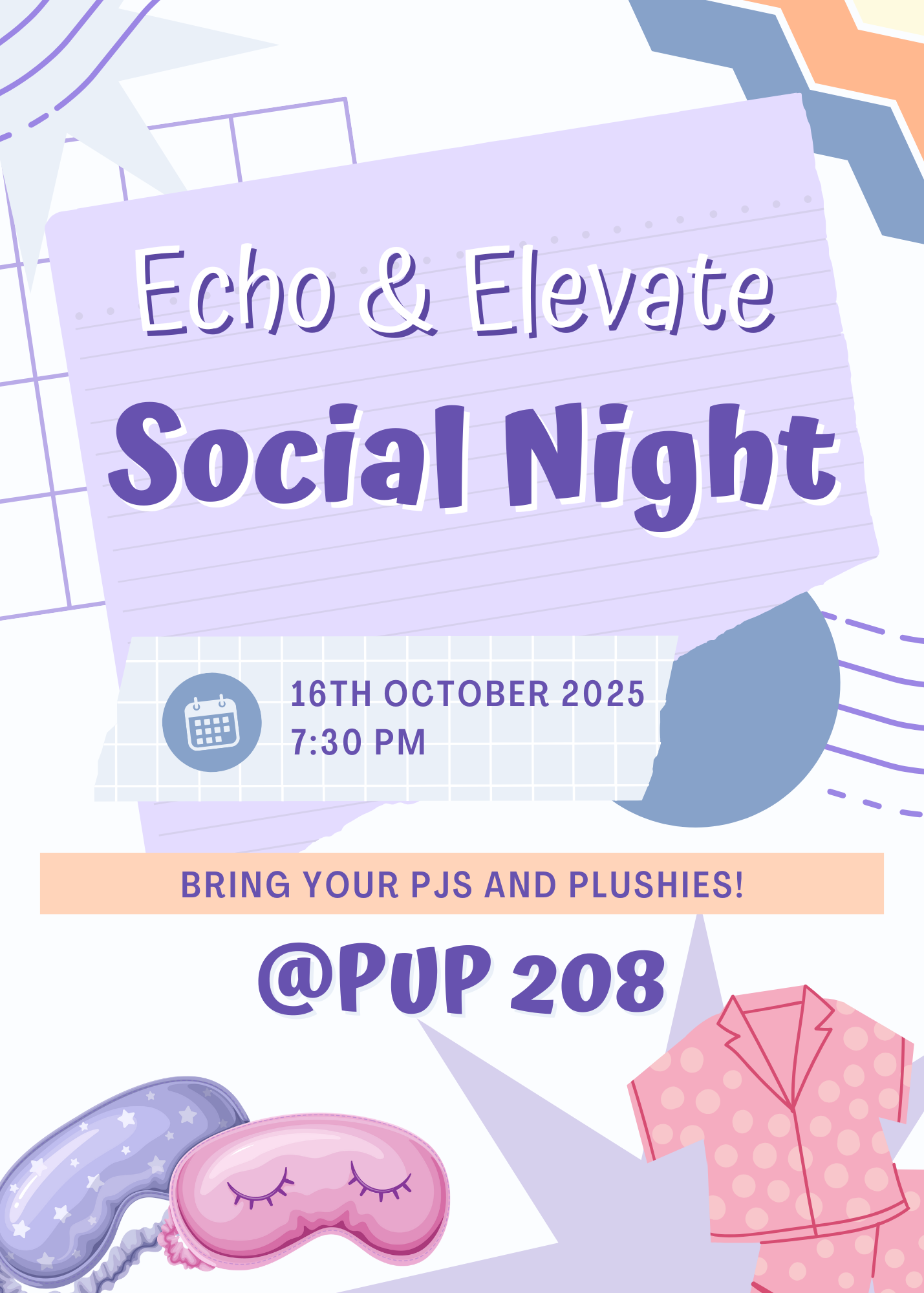 Hi everyone! We're Echo & Elevate! We are a new Christian org and we wanna get to know you. Join us in your pajamas and plushies as we mingle and play games. Everyone is welcome. Can't wait to meet you!