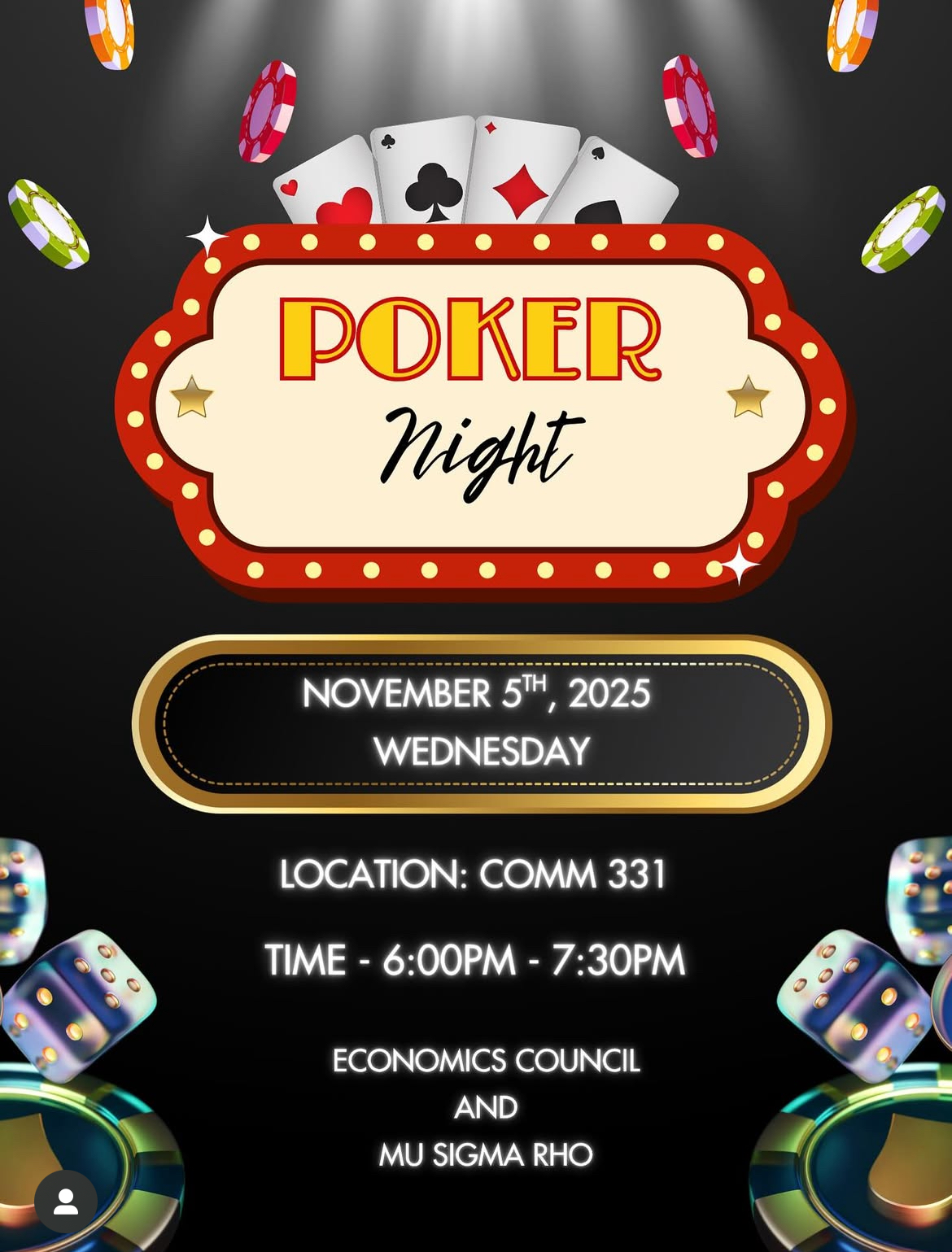 Join the Economics Council and Mu Sigma Rho for an exciting Poker Night on TOMORROW Wednesday, November 5th, 2025, from 6:00–7:30 PM in Commons 331!